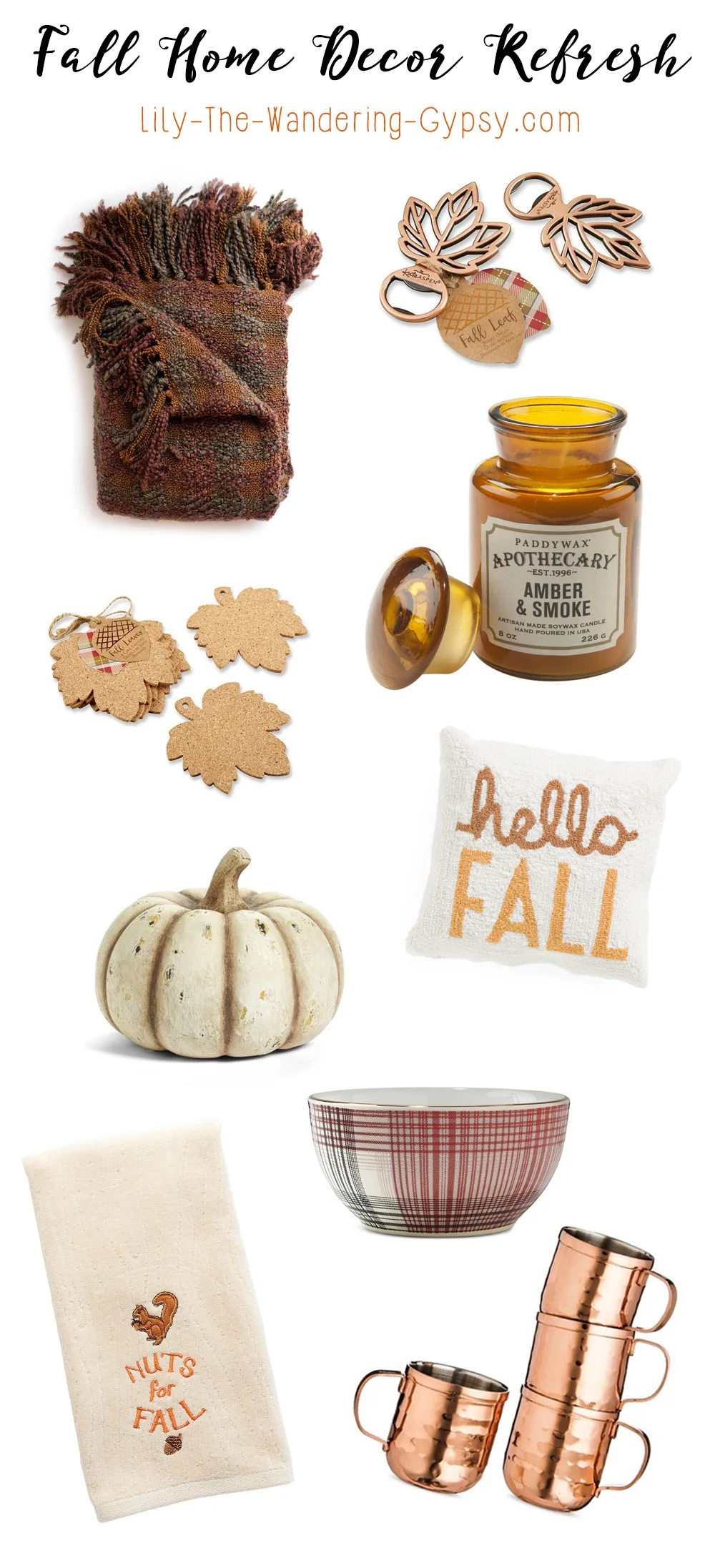 Plaid Blanket // Candle // Rustic White Pumpkin // Hello, Fall Pillow // Nuts For Fall Kitchen Towel // Plaid Bowl // Copper Mugs // Kate Aspen Copper Bottle Openers // Cork Leaf Coasters