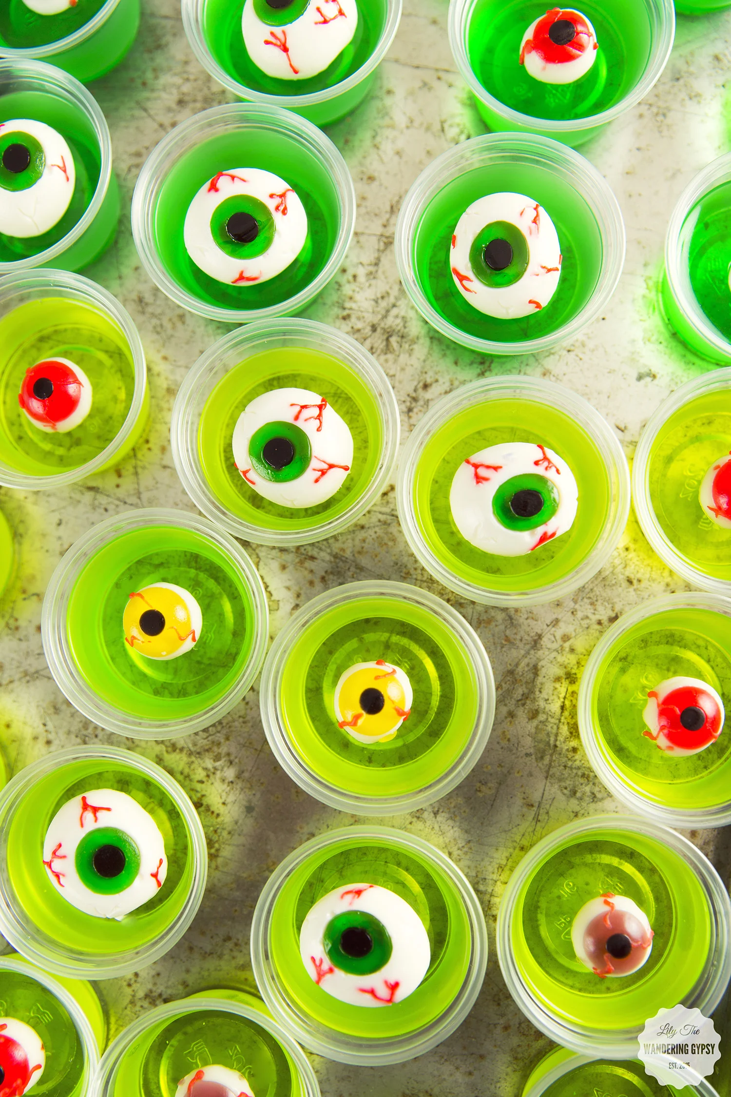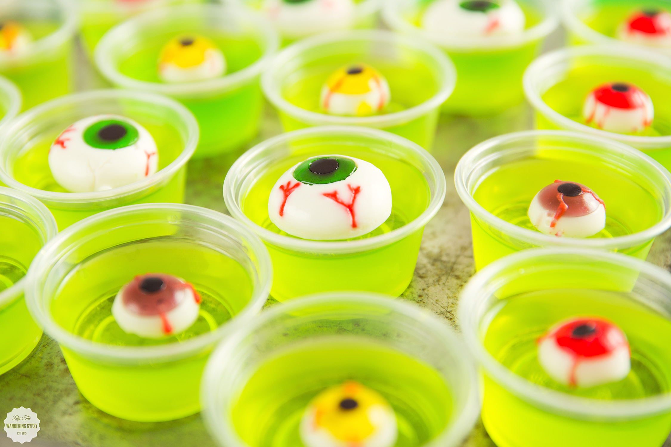 I thought that these lime-green colors would be perfect for my Halloween theme. Looks like literally everything wound up being this fun, slime green color, which I just loved. So, I used a green apple flavor and a lime flavored Jell-o, and made my Jell-O Shots by replacing half the water with any liquor you would like. Vodka is a good choice, but you can also use something like rum, which would go down a lot easier :) I got these eyeball gummies at Walmart, too. I also found these individual cups (which also come with lids, for serving on the go or at a party). This project was so much fun! Wait until the Jell-O has completely firmed up before adding the eyeballs on top.