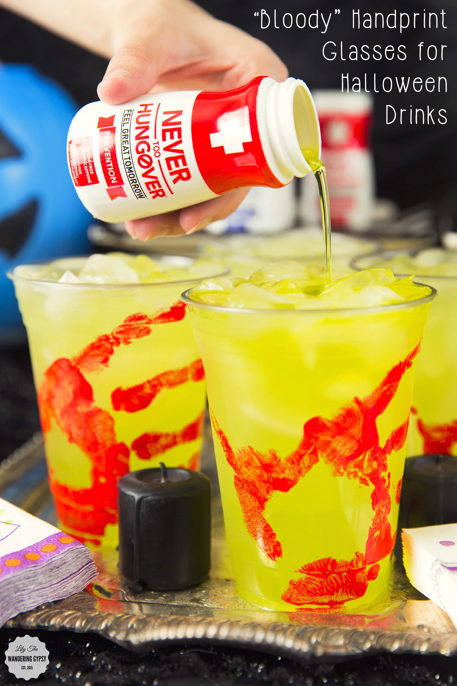 Use any latex-based red paint and some clear plastic glasses for this fun project! I painted red paint one of my hands, and wrapped my hand around the glass as if someone with a blood on their hands reached out and tried to steal your drink! I let them dry for about 20 minutes, and was surprised at the fact that the paint stayed put even while the glasses became wet from condensation! Definitely would not recommend any paint besides acrylic for this reason. This whole project only cost like $3 plus the price of the ice and drinks inside. Margaritas or some lime-based drink would be best for this, because you could carry the slime green color throughout this part of your setup too. Also, Never Too Hungover comes in a limeade flavor AND, you can mix it into your drink! I was pleasantly surprised to see that the Never Too Hungover was the exact same color as my drinks! So funny :)