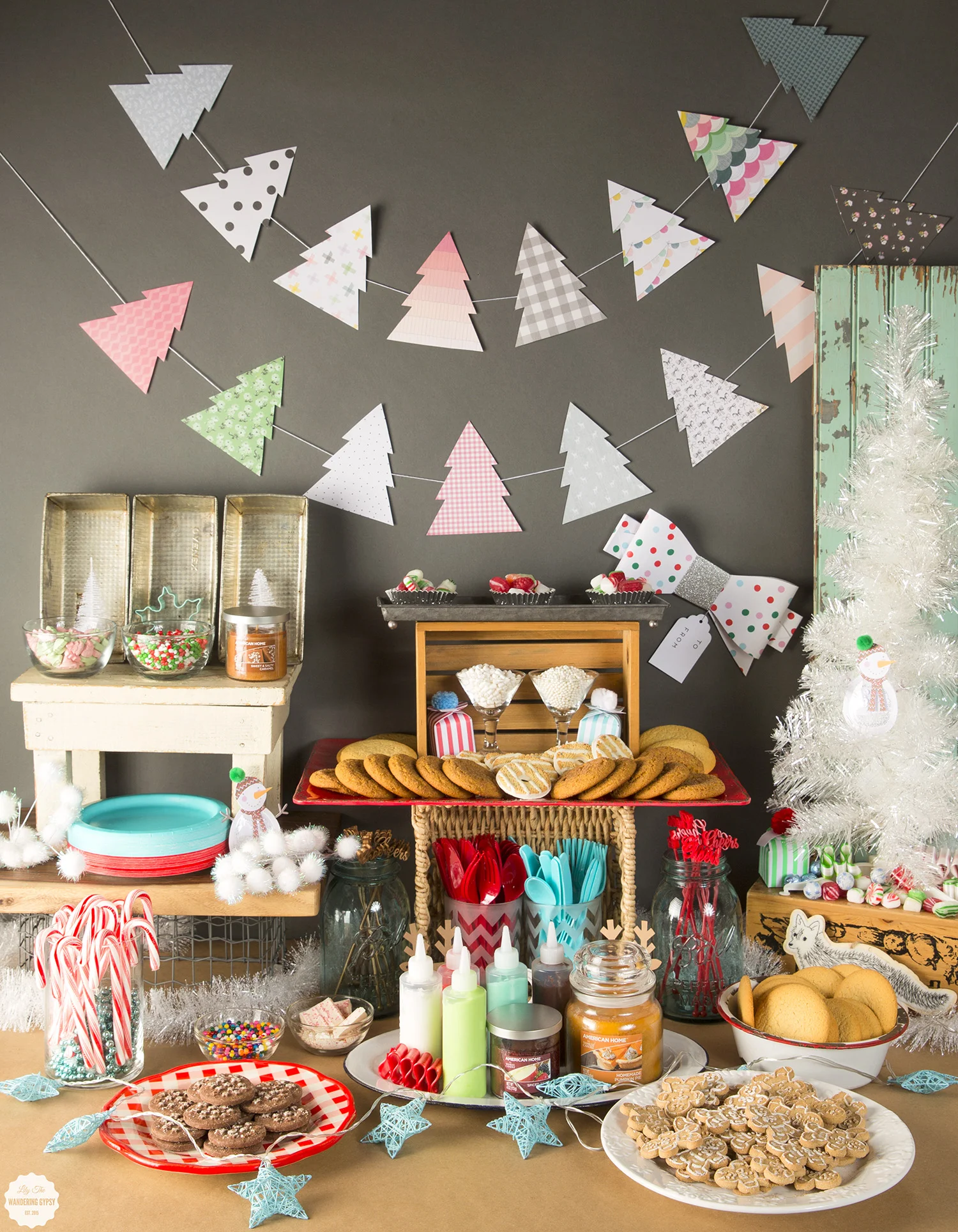 I loved focusing the look of this party on vintage touches, and found such pops of color in red and aqua. I loved using this white Christmas Tree and garland, and I made this super adorable tree garland (Inspired by Scandinavian design). The icing colors that I mixed up wound up matching SO perfectly!