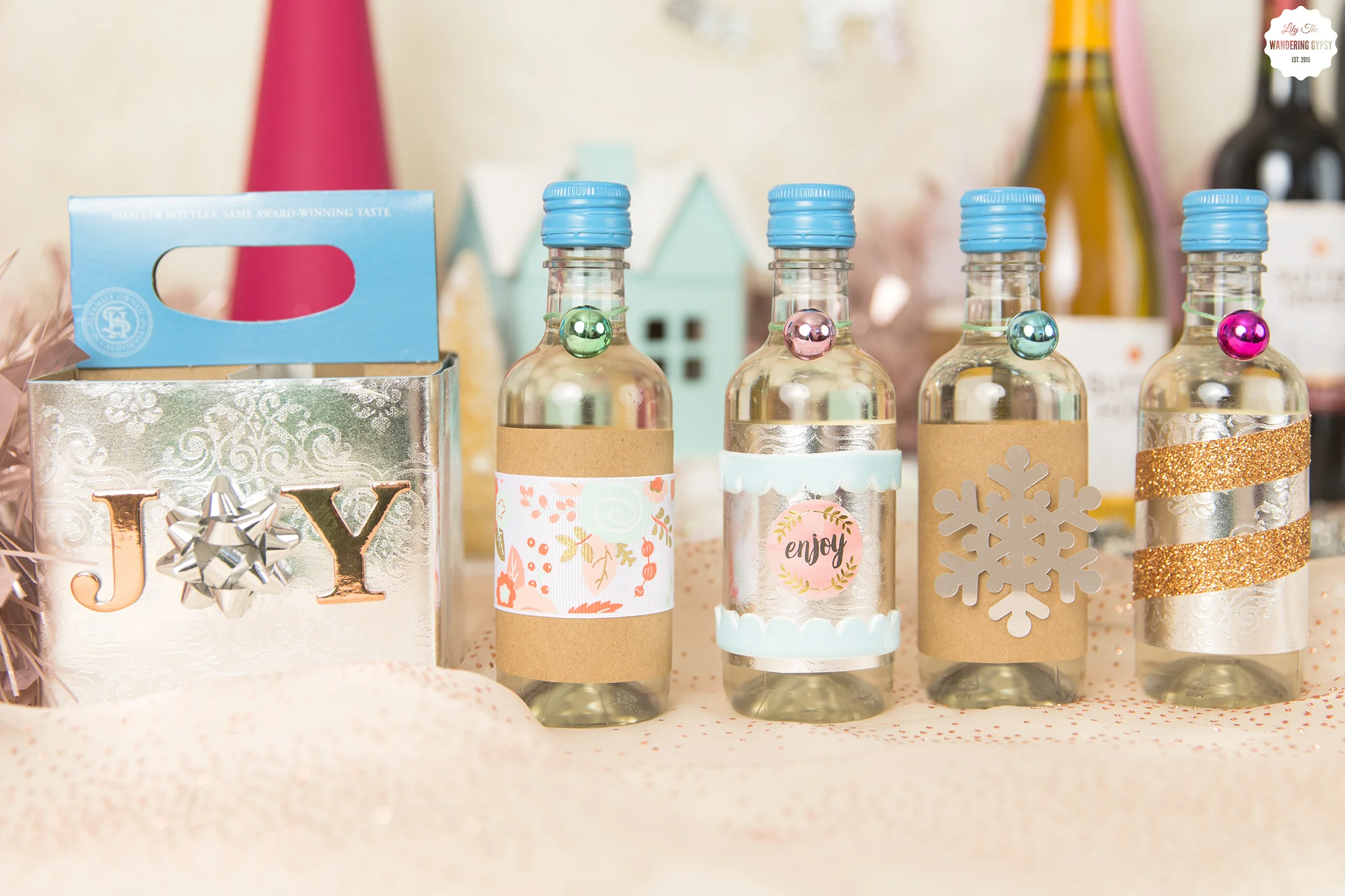 HOW TO: Cut a piece of wrapping paper in pieces that are 6.75" long x 2.75" tall. I used silver paper and kraft paper. I taped each label to the mini wine bottles, then added ribbons and stickers over top of the papers. I also adorned the tops of the bottles with wine charms, made with metallic mini ornaments, tied with embroidery thread.