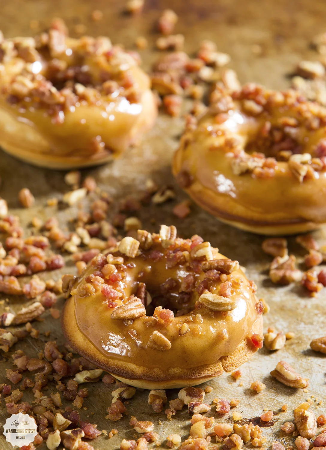 This was also my first time really making a glaze for donuts, and it turned into more of a caramel because I heated the mixture a bit too long, bringing the sugars to kind of caramelize. Oh well, these are amazing, and I loved topping them with an unexpected ingredient - bacon bits and pecans. That bacony flavor really goes so well with the other flavors, that I am so happy I added the bits.