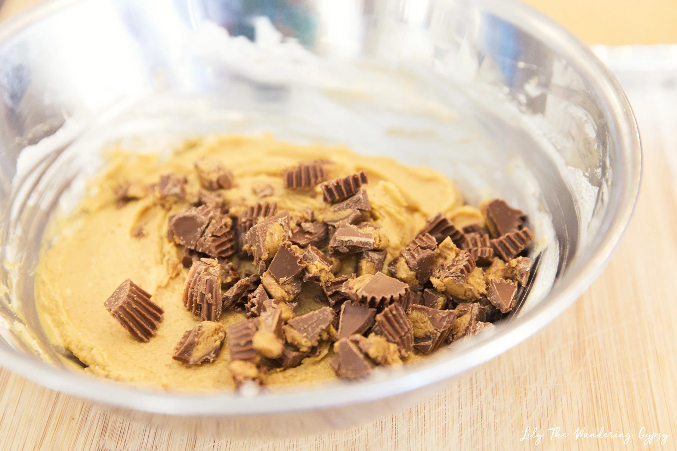 3.) Add in your peanut butter cups, and combine thoroughly with a large spoon.
