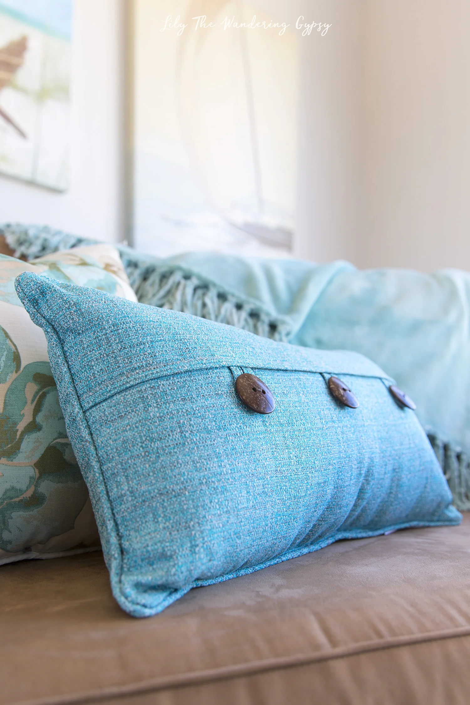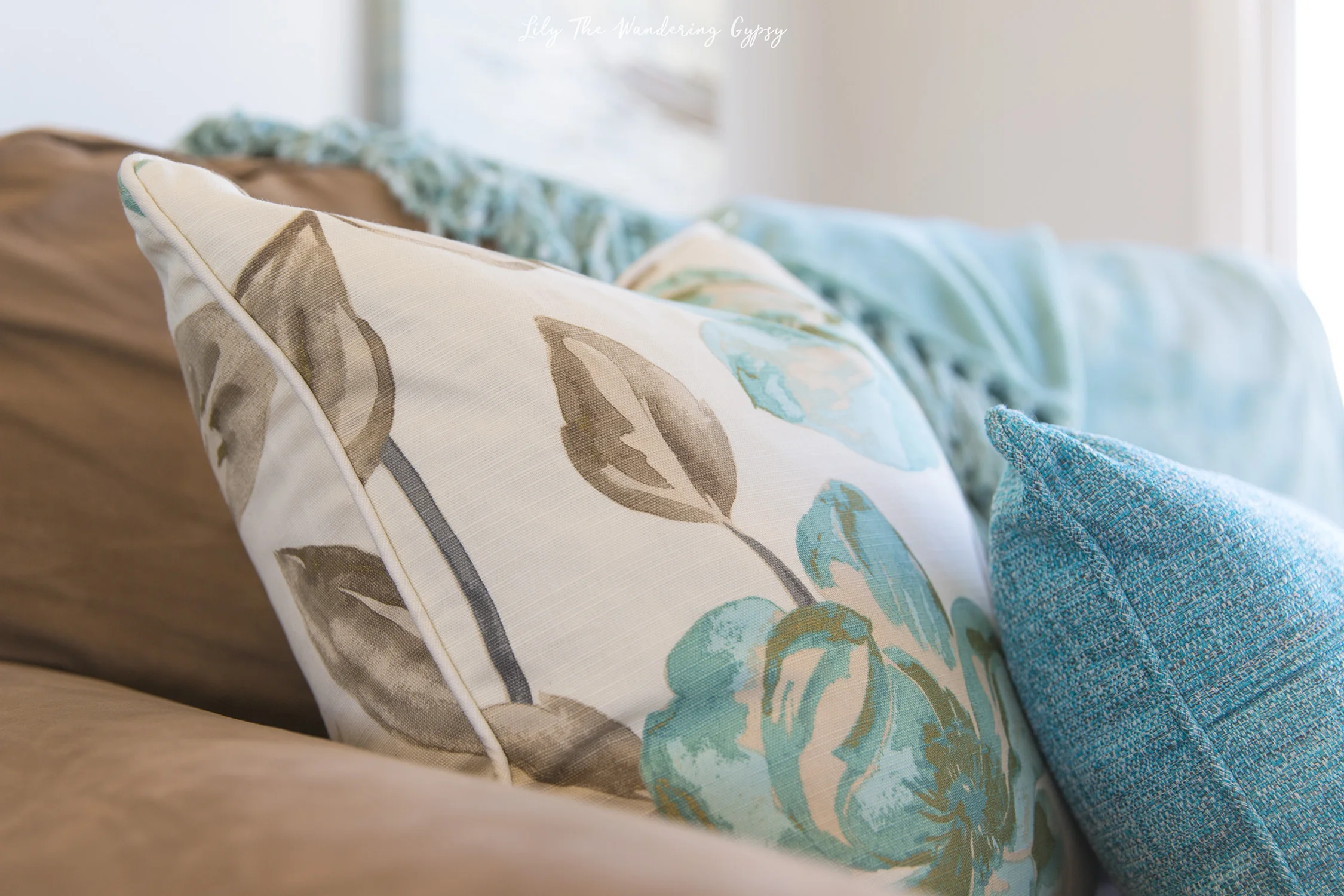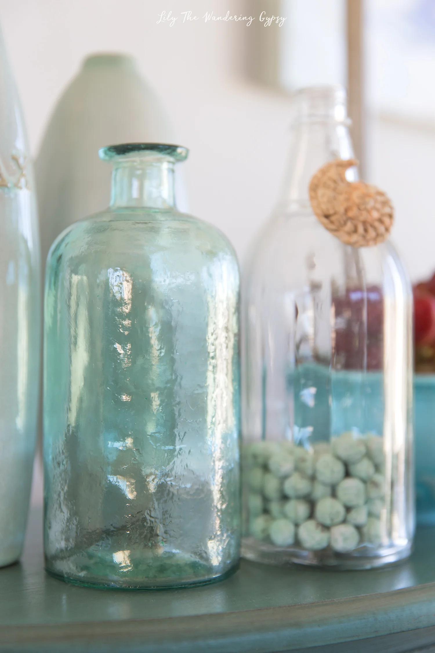By adding bright, new pillows, a soft blanket, wall art, a cute lamp, a turquoise table, and also sea glass colored bottles, I was able to add my personal touch in my favorite color family! See what a bit of color can do to change your space with just a little bit of effort? The space is more inviting, and also captivates my eyes, bringing back memories of the ocean, tropical breezes, cool drinks, and a bit of turquoise from the southwest (namely Arizona and New Mexico, in my travel experience).
