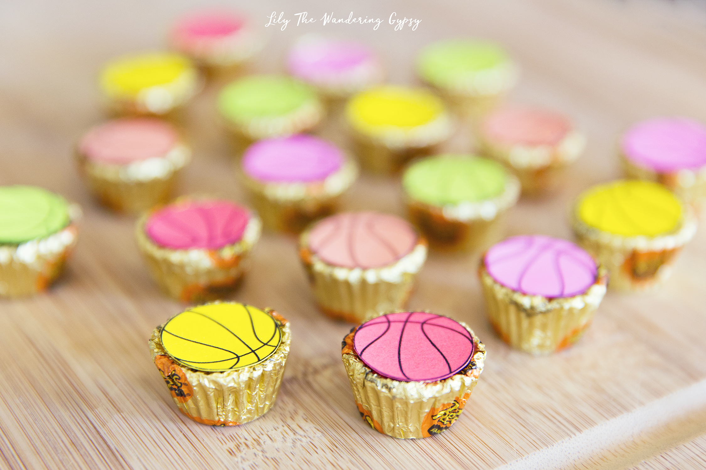 At first, I was going to use all orange paper to create my basketballs, but after sifting through all of my paper colors, I was drawn more to the bright, less traditional colors like neon yellow, pink, coral, and a few more. I printed off basketball shapes that measured 1.25" across, onto card stock paper on my black and white printer. This was such a cost effective way to make decorations! Feel free to use your favorite team colors, or go with your 5-6 favorite colors. After I printed the shapes, I cut them out, and taped them to the tops of these peanut butter cups, and wow, they turned out so well!