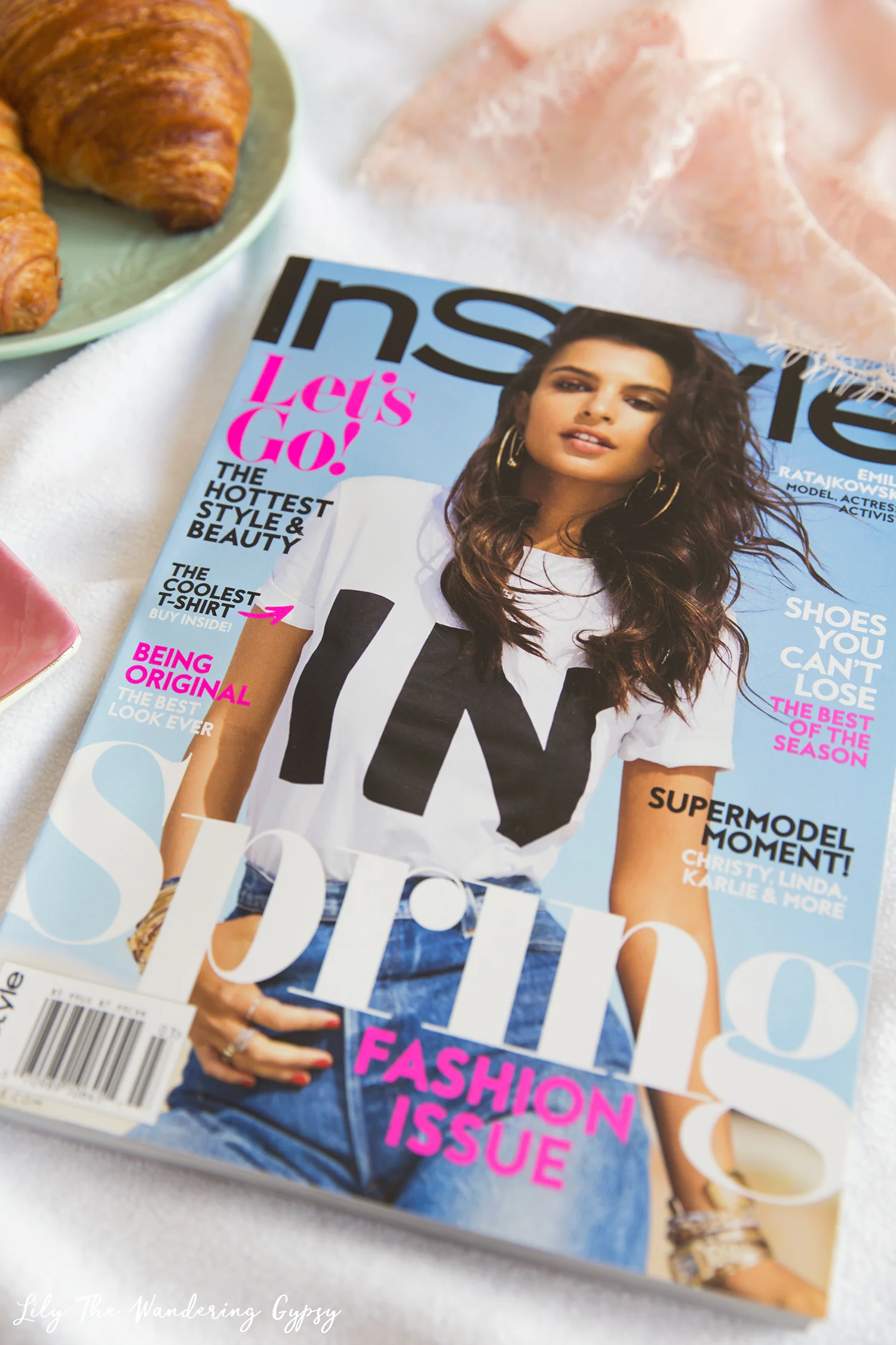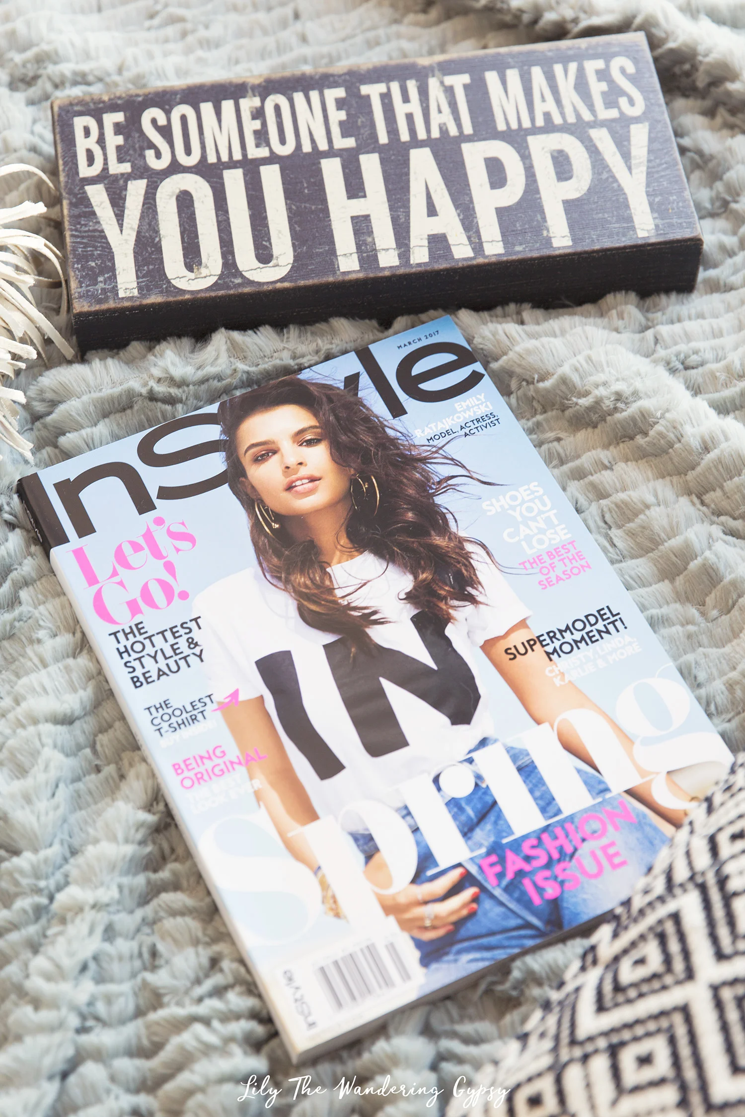 Next, I love to sit down under a comfy blanket on the couch and read. I am not the type to grab a novel (my attention span is WAY too short for that – but a good magazine is perfect. I picked up the March issue of the InStyle magazine, and LOVE the Spring trends I read about. Being a full-time blogger, and a social media guru, I have to keep up on the latest trends, and the magazines tend to actually share info faster than some of the fast paced websites that do not have very in-depth articles. I love the article called, “her style”, sharing cover star, Emily Ratajkowski’s favorite finds like adorable pink sling backs, her favorite makeup finds, and her favorite go-to snack (hint, hint, it’s sushi!!).