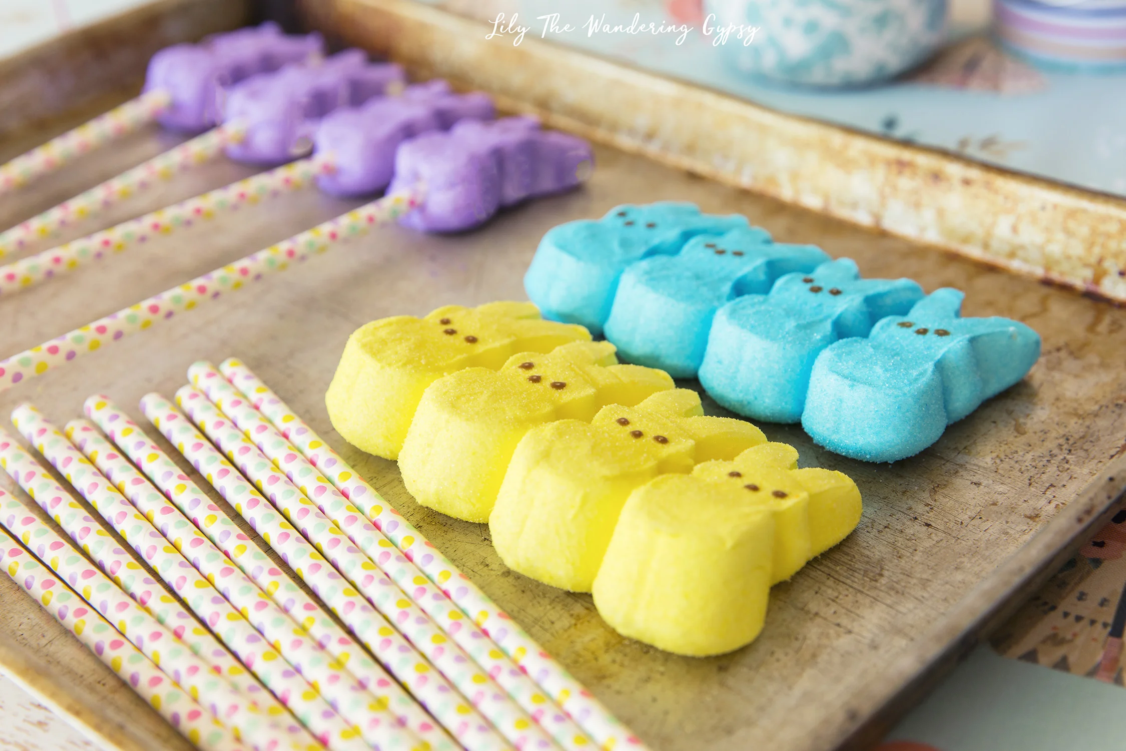 Make some quick and easy DIY Bunny Pops with little marshmallow bunnies and paper straws, also available at Walmart. Simply insert the straws into the marshmallows and you're DONE! I displayed them in a wooden crate from Walmart, adorned with scrapbooking paper from a craft store. I would recommend placing some styrofoam beneath the wooden crate to stick the paper straws into, so the pops stand upright better. What a fun and inviting display for these treats!