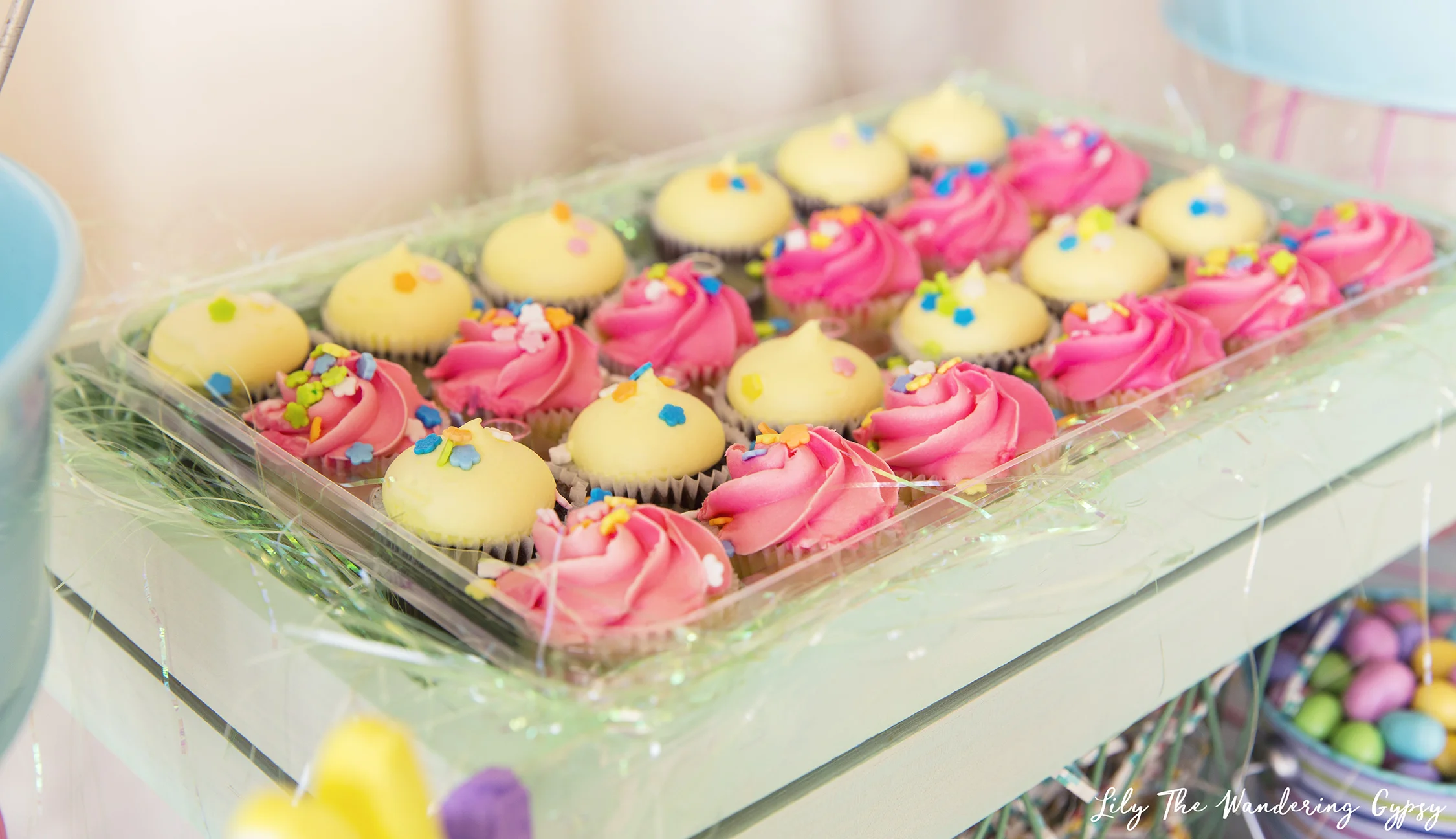 Another creative way to display treats for your Easter party is to grab a shallow wooden crate, add Easter grass to it, then place some mini cupcakes into the wooden crate. Looks like a little field of flowers, ready to be eaten. Yum!!