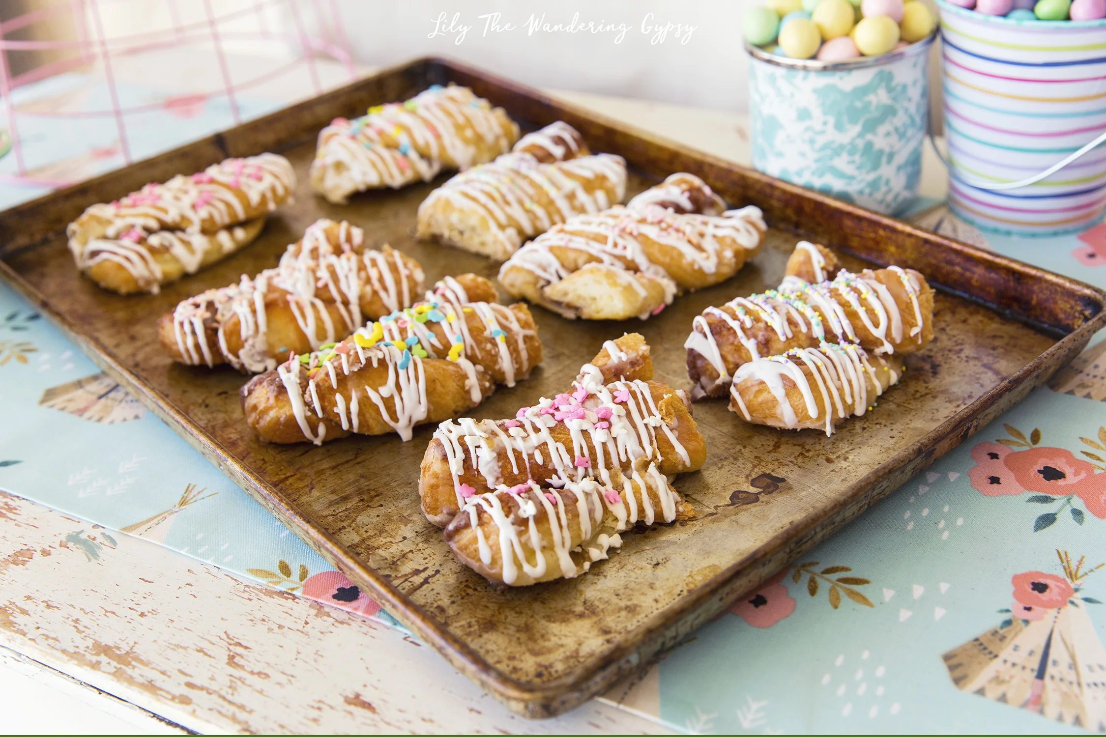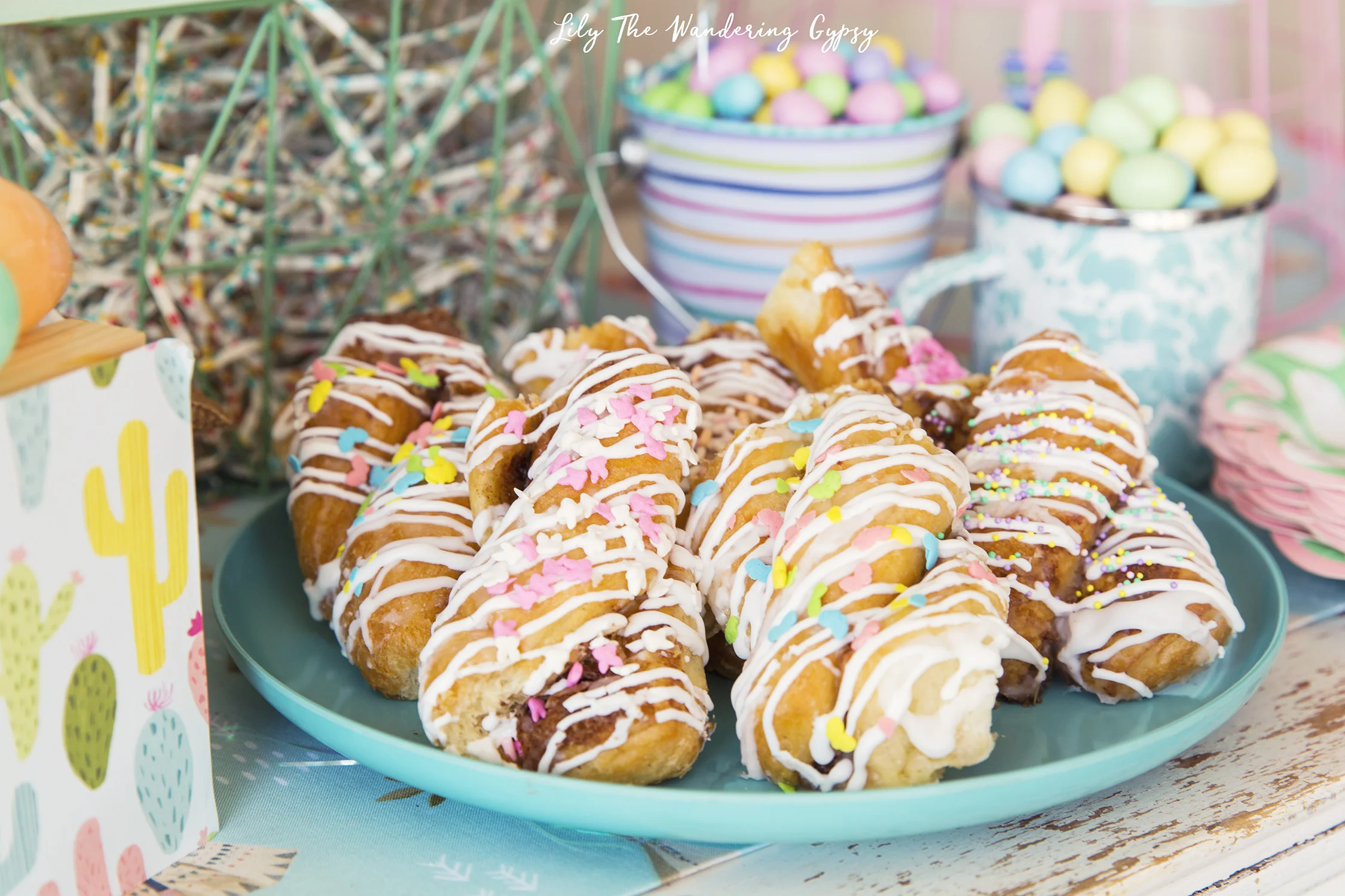 Another idea to spruce up some goodies for Easter is to find store bought pastries, and add more icing and sprinkles!!! These normal cinnamon-donut style treats were pretty basic until I added some more decorator icing from a tube, and loads of Easter and Spring colored/themed sprinkles. Cinnamon rolls can be embellished too!