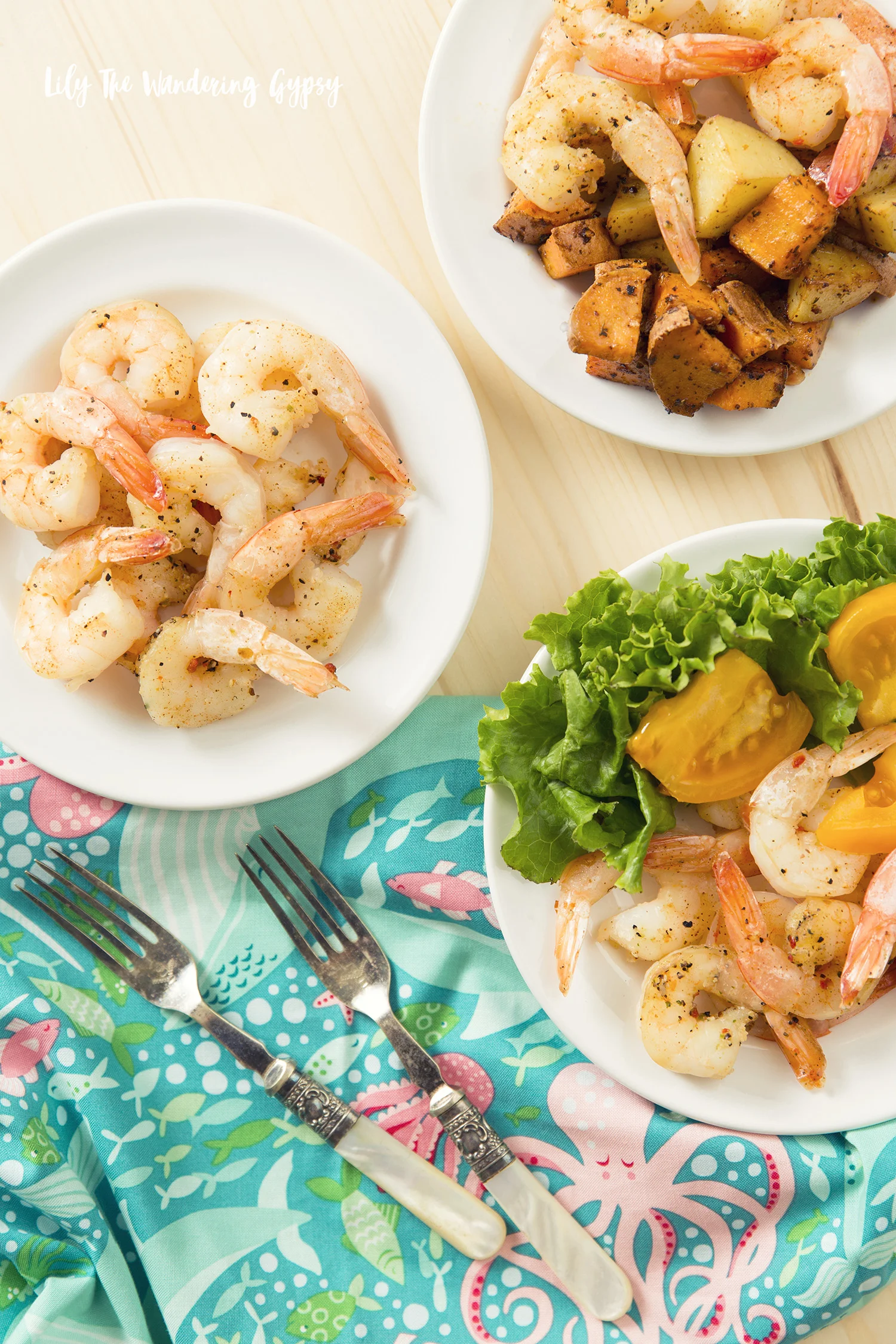Shopping for this dinner was super quick as well. All I needed was my white shrimp (prepped by the store), a couple of sweet potatoes, 2 small red potatoes, and a head of leafy, green lettuce. I had everything else at home, like olive oil, Worcestershire sauce, seasonings, and salad dressing, so this was really a great experience.