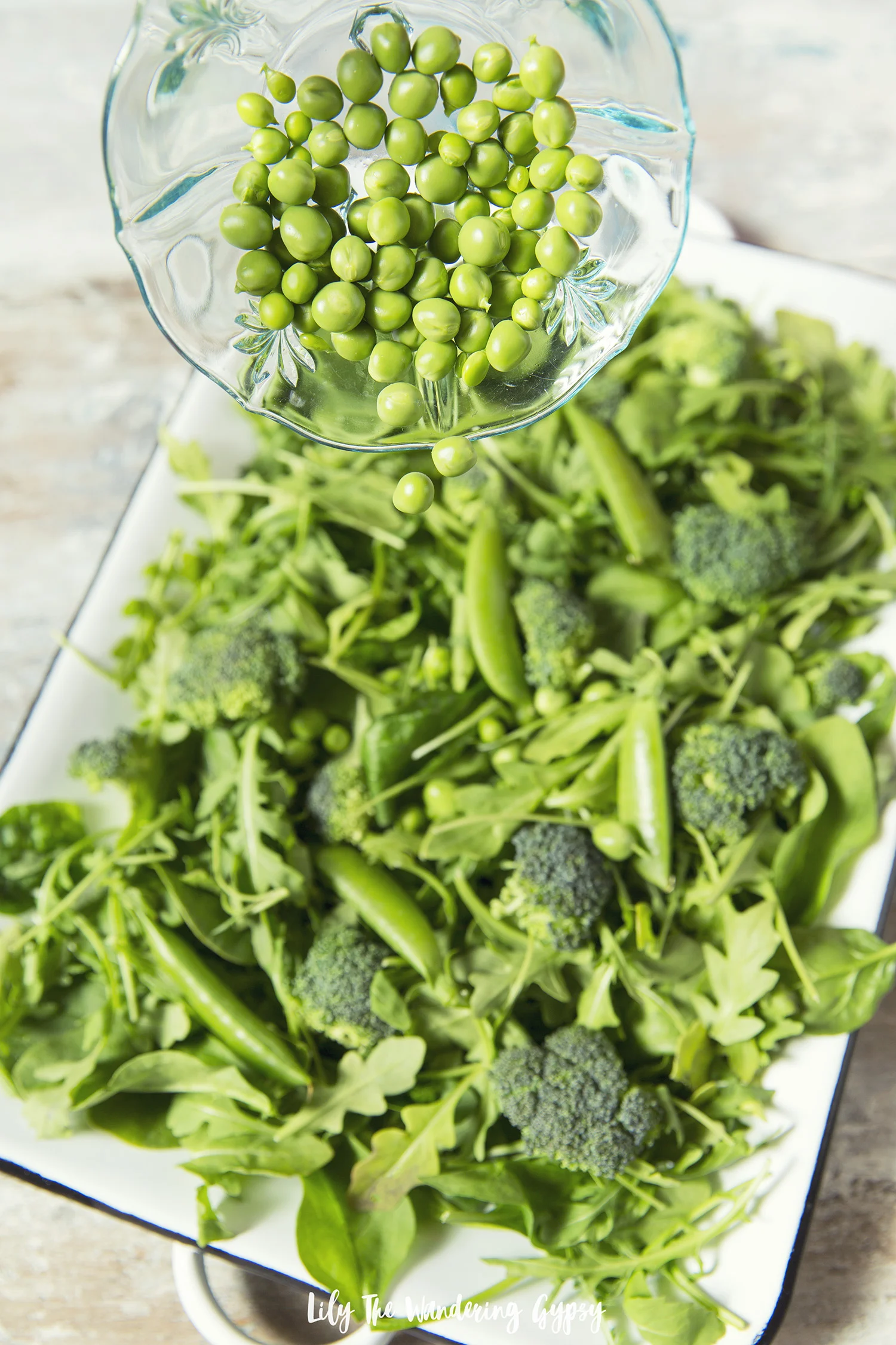 1.) Gather salad ingredients (basically anything green to orange!). First layer on your fresh spinach, then your arugula too. Time to prep some of your pea pods! Taste test each variety of pea you got and take mental notes. How sweet are they? Do you like the consistency of the pea pod, or do you just prefer to eat the circular peas inside? Shell about 14-1/2 C, of the peas, and reserve the rest of the pea pods to use on the salad whole. I cut just a little bit of the carrot top off, and reserved as much of the orange part as possible. I left the carrots whole because they were so tiny anyway, they were practically bite sized and amazingly pretty!