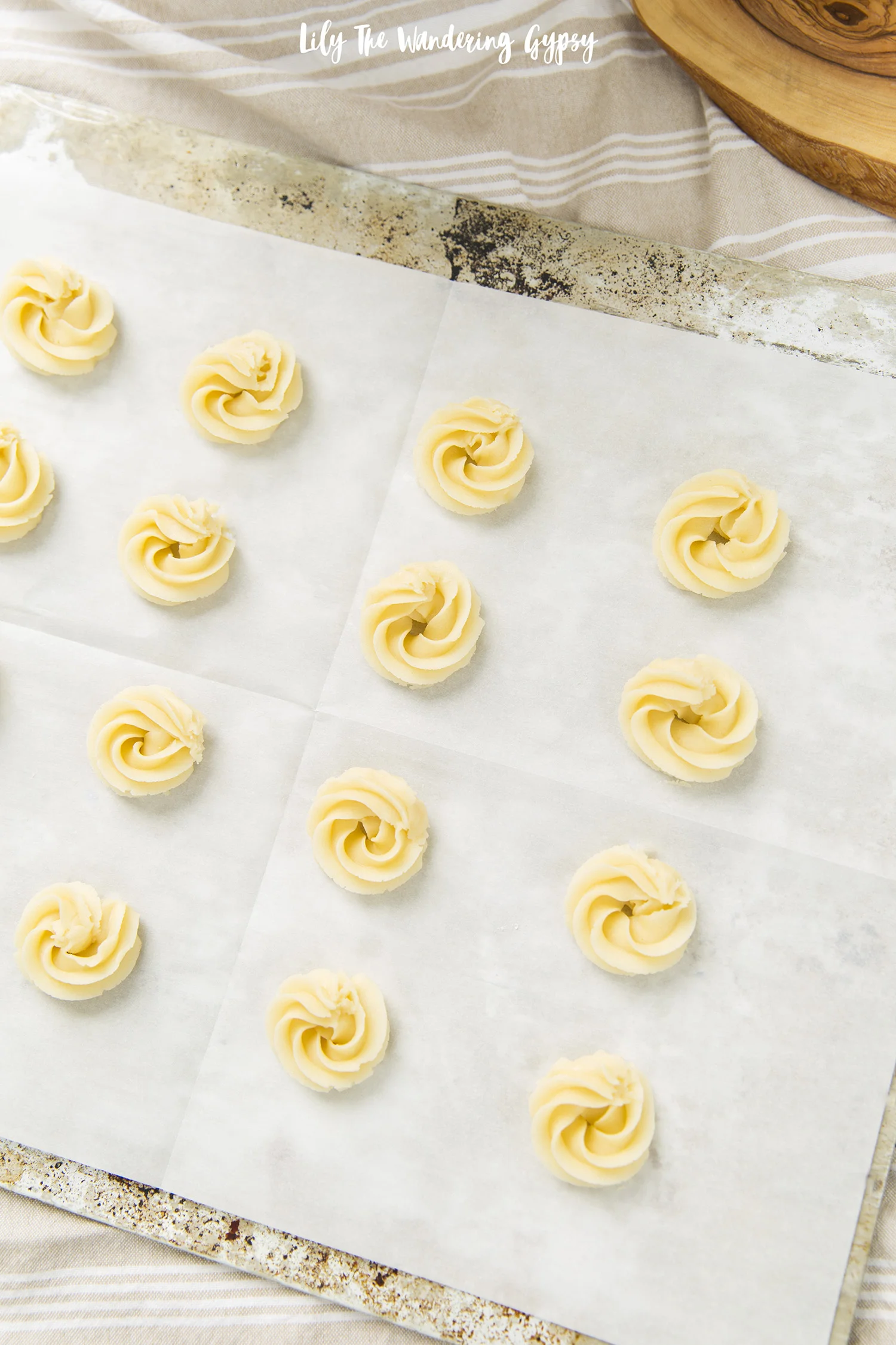 3.     Place the dough into a pastry bag fitted with a very large star tip, and pipe onto a parchment paper lined baking sheet. Depending upon the size of your star shaped pastry tip, this will determine whether you can have 12 or 18 cookies per sheet. Bake the cookies for 10-12 minutes or until lightly golden.