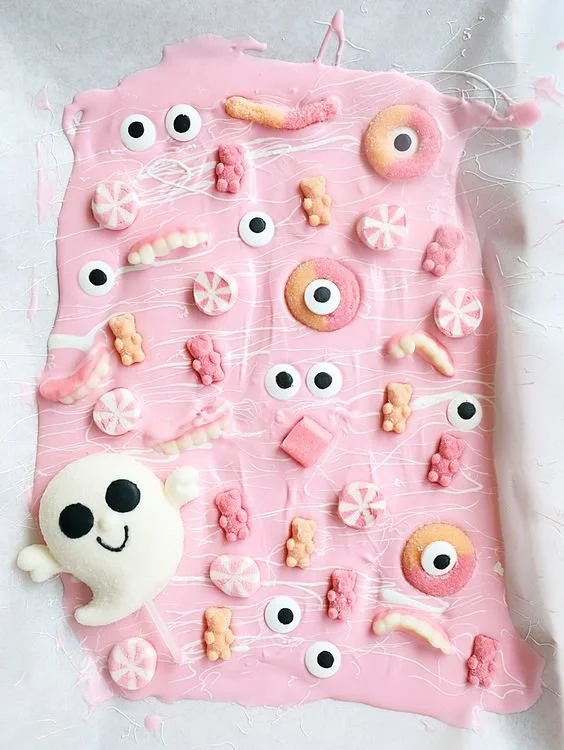 Pink Halloween Bark Recipe via A Bubbly Life.