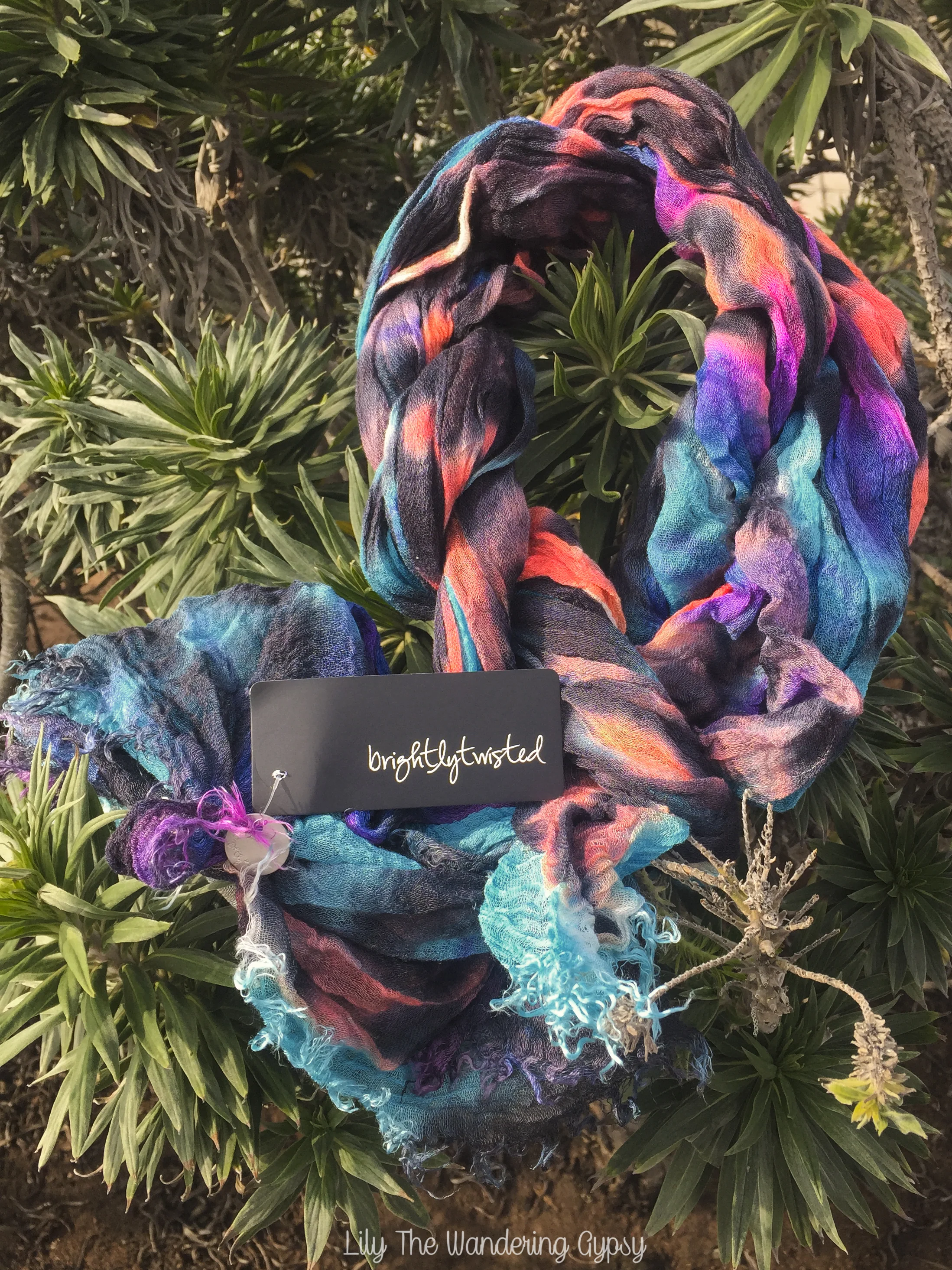 I have a soft spot in my heart for beautiful tie dyed goods! I even have a Tie Dyes board on Pinterest. The mixing of sometimes unexpected or pleasantly complimentary colors that blend in unique ways really amaze me. Each piece is incredibly unique, no matter how hard you try to make two alike. I tried my hand at doing a little bit of tie dye work a few years ago, and I know how much time and effort each and every piece takes. So, when my friends at Brightly Twisted asked me if they could send me some of their beautiful work, I said, heck yes! I have admired their work for quite a while now. Although they didn't ask me for anything in return, I chose to take a few photos of their work and share it here! I wish I could convey just how incredibly soft all of their materials are, some made from Bamboo!