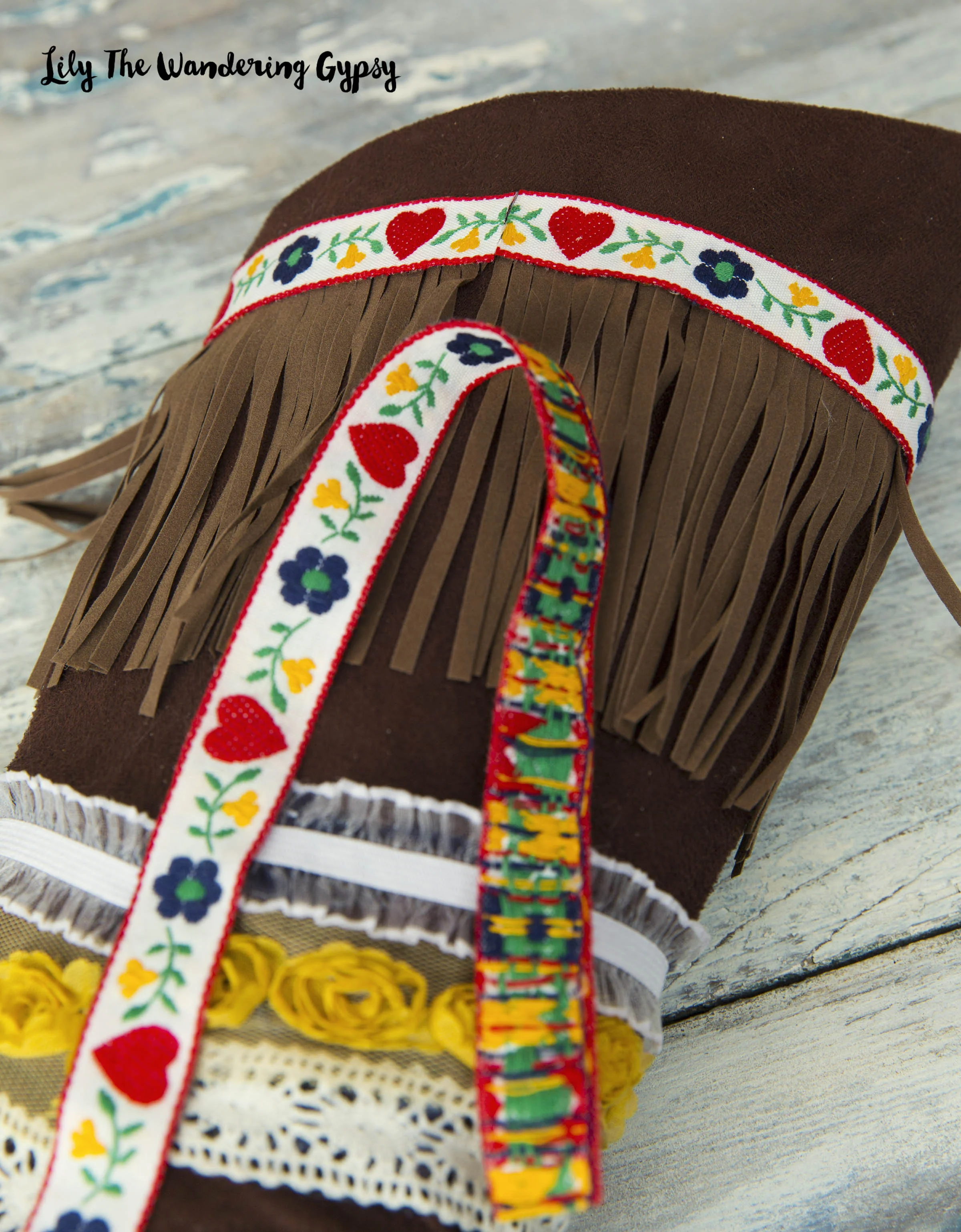 You will see that I also added the ribbon to go up the side of the boot. Glue this in place, making sure to only glue half way up. The fringe will also go under this ribbon!