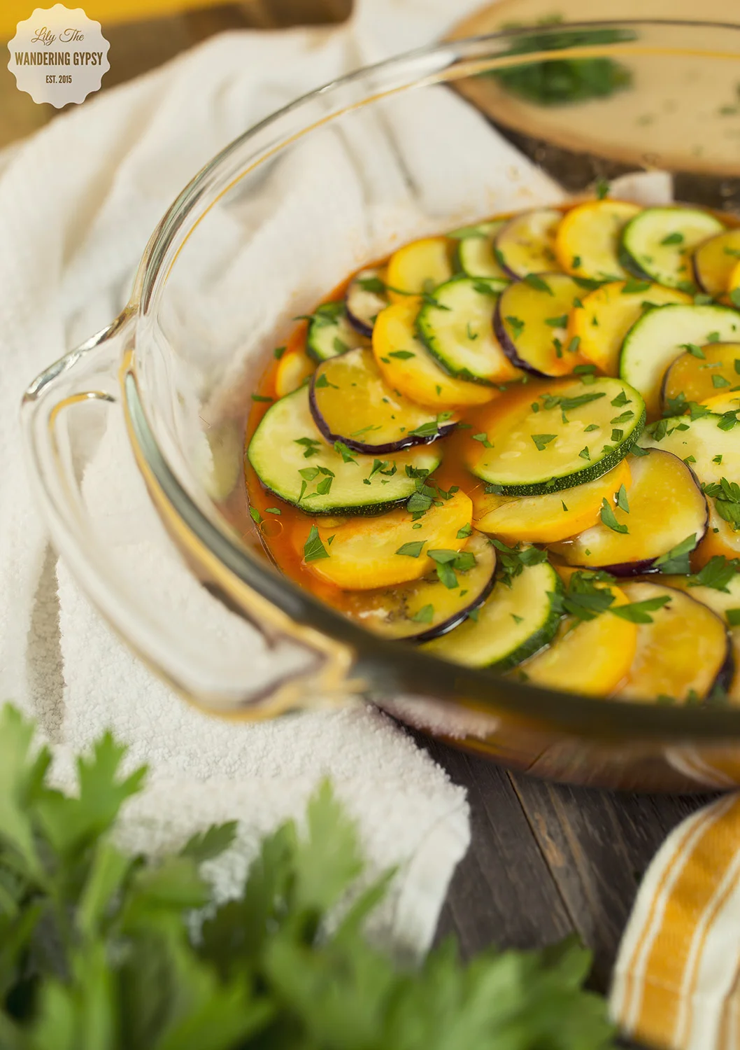 7.) Brush olive oil onto the veggies, carefully as to not get sauce on top of the veggie slices. Add salt and any other seasonings you want to the top of the dish. Garnish with chopped, fresh parsley - this adds so much to the look of your dish!