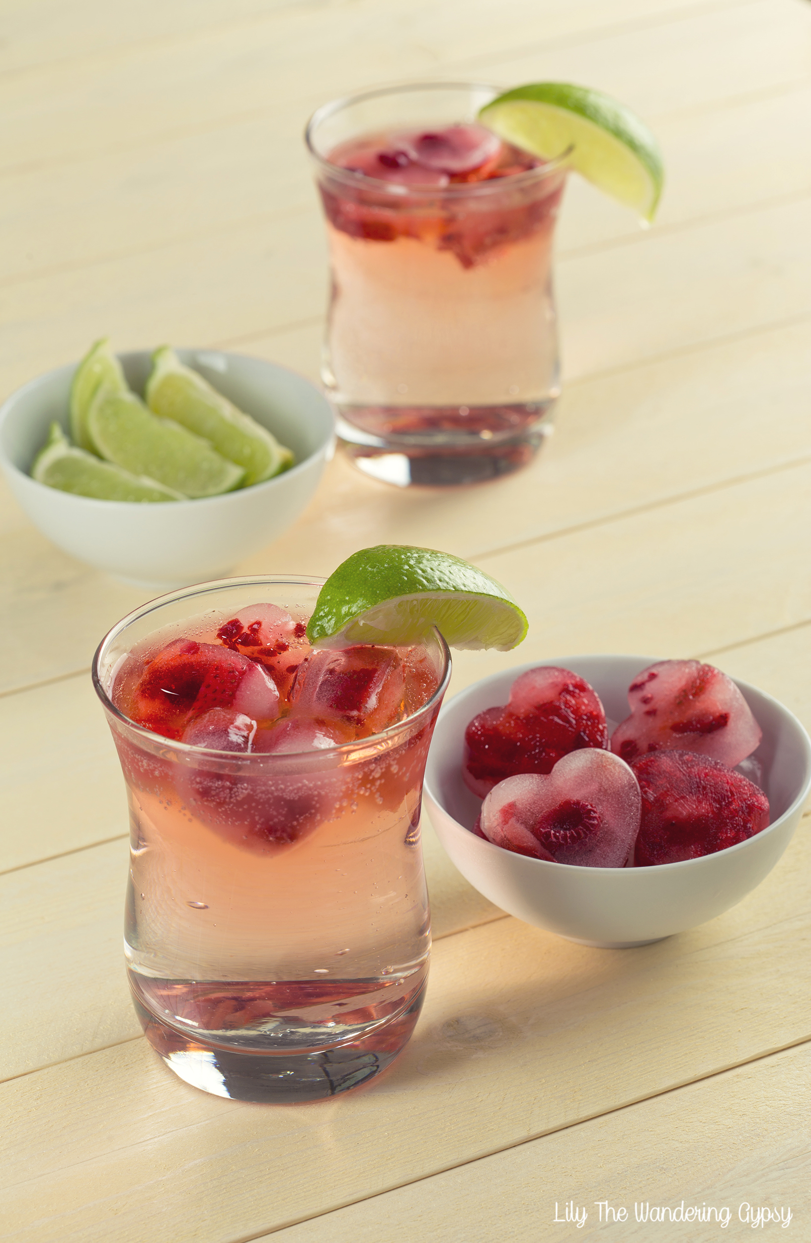 If you love a Gin and Tonic, this recipe is just for you! This drink is light, refreshing, and really goes down smoothly! This Gin and Tonic has a hint of lime, strawberry, and raspberry. And, these would be perfect for Valentine's Day or Date Night! For the ice cubes, in a heart-shaped silicone mold, I filled them up half way with frozen raspberries and chopped up frozen strawberries, then filled the rest of the way with regular water. They're so cute!