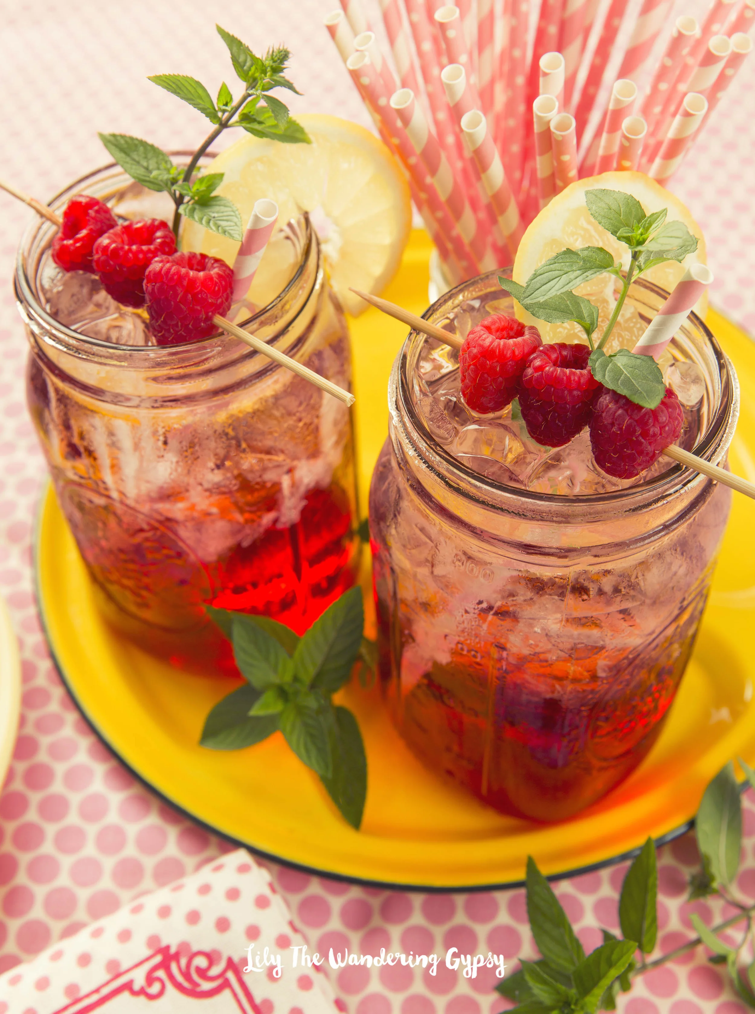 To Garnish - Poke skewers through 3 raspberries, set on top of glass. Slice lemons, and put them onto your jars. Top with fresh mint, and serve. Mix the mint into the drink for a bit of extra freshness! Enjoy.