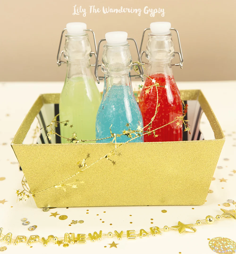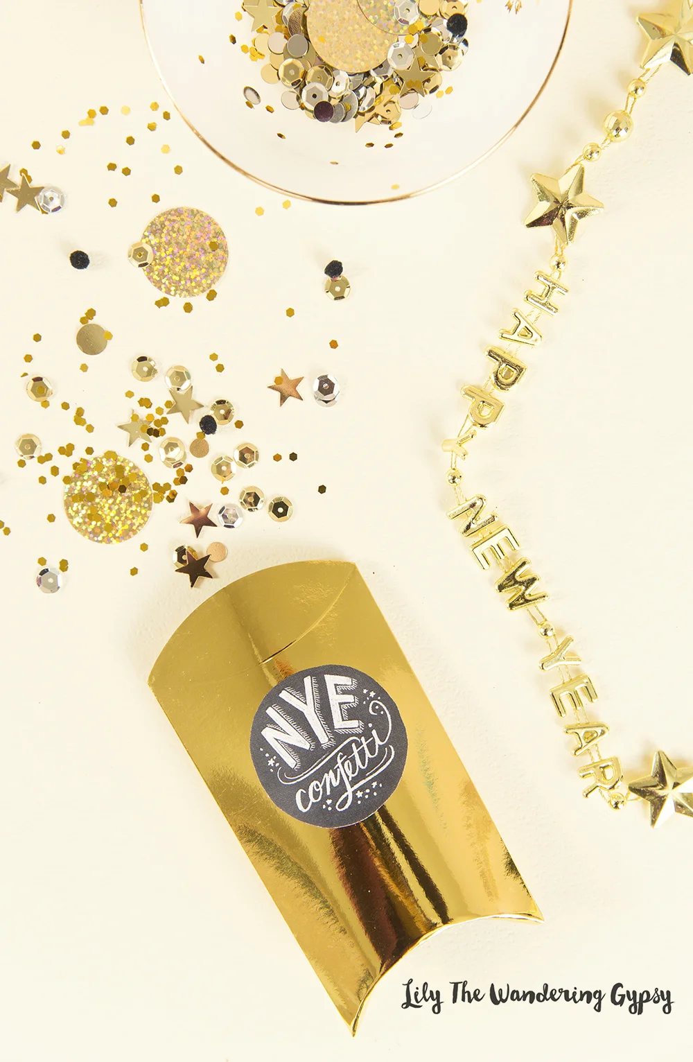 Simply cut out the NYE circles, and affix them to the gold pillow boxes with double sided tape. Then, mix up a bunch of glitter, sequins, gold stars, and/or other pre-made confetti in hues of gold and silver. Basically anything that shimmers could go into these. Love the look of all that shine!
