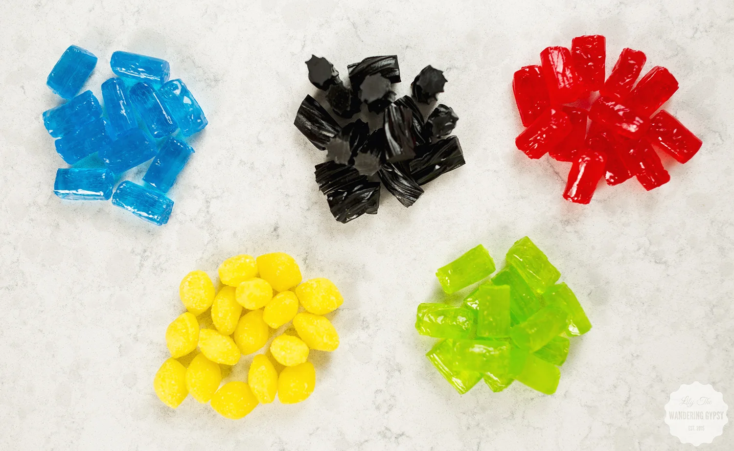BLUE: Blue Jolly Ranchers - BLACK: Black Licorice + Black Food Dye - RED: Cherry Jolly Ranchers - YELLOW: Lemon Heads - GREEN: Green Apple Jolly Ranchers + Lime Green Food Coloring