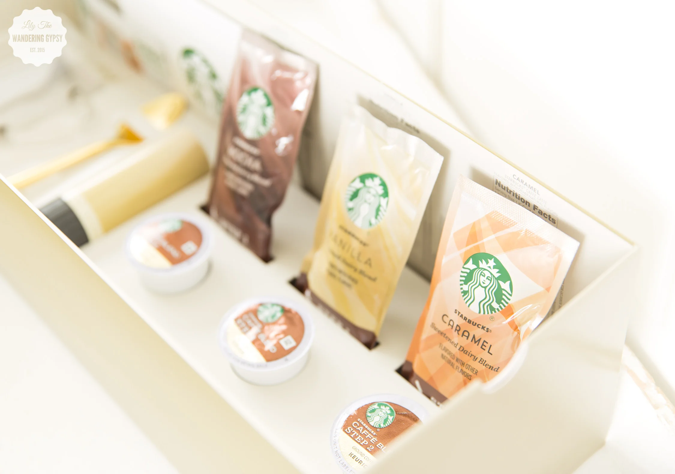 When I received this Starbucks® Influencer Gift Box in the mail, I was pleasantly surprised by how beautiful everything looked. It included: A Glass Starbucks® Mug (which is amazing!!), A Gold Spoon, Confetti popper, three samples of Starbucks® Caffe Latte K-Cup® pods, one (1) 6-Ct box of Caramel Caffè Latte K-Cup® pods. SO excited to have been so lucky to have received something SO nice to sample and ahre with you on my blog.