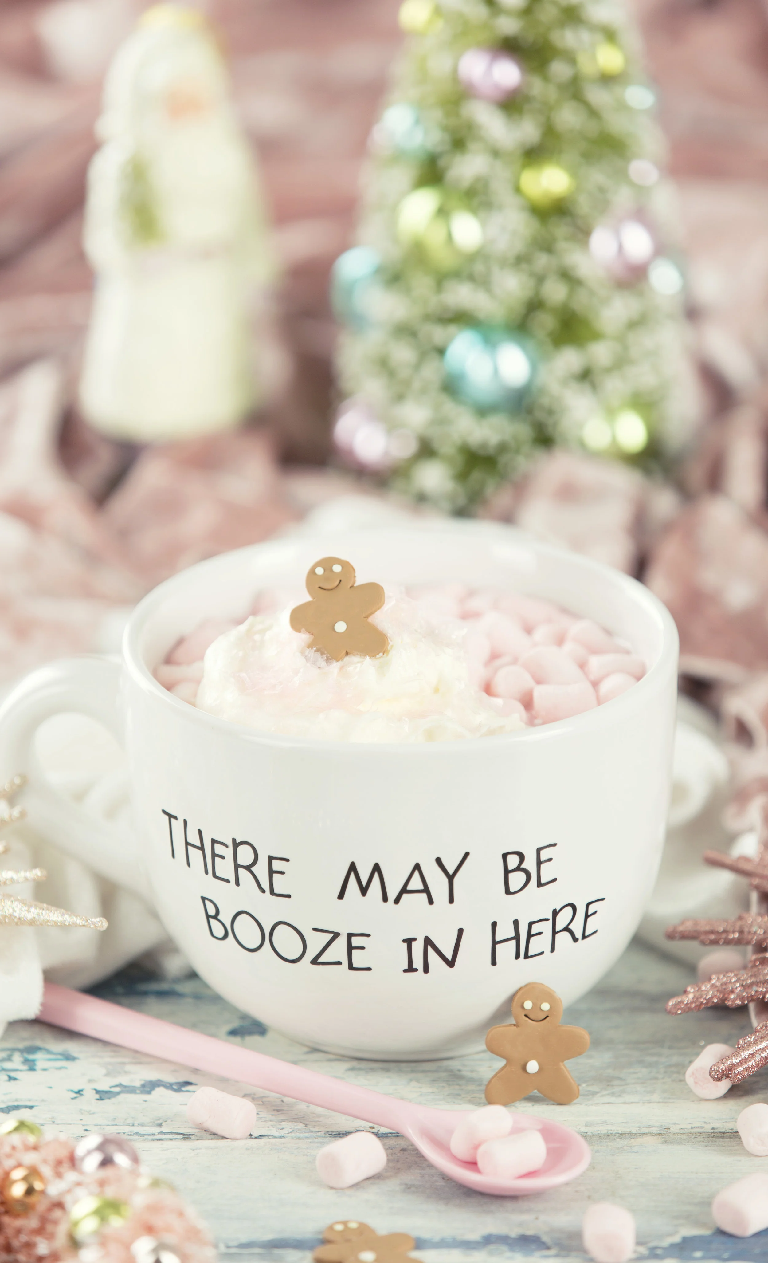 To make the cutest Pink Hot Cocoa Ever, simply heat 2 cups milk, 4 ounces of white chocolate, and a few drops of pink food coloring in small saucepan. Now for the best part: add 2 ounces of rum or your favorite liquor, and top with whipped topping, light pink shimmering sprinkles, and pink marshmallows. To make the mug, I added little letter stickers and very carefully started with the middle words and worked my way out, so everything would be centered.