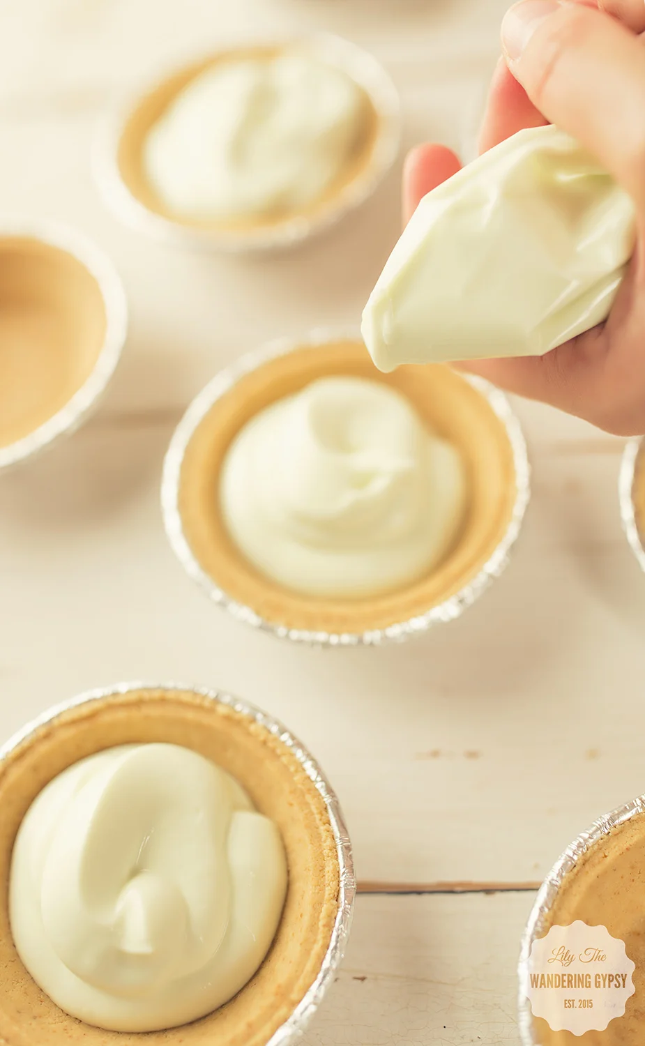 Fill a quart sized freezer Ziploc® bag with the Oikos® Greek Key Lime yogurt (2 yogurt cups filled about 3 mini pie crusts). Cut one corner off of the bag, and carefully fill each mini pie crust about 2/3 full.
