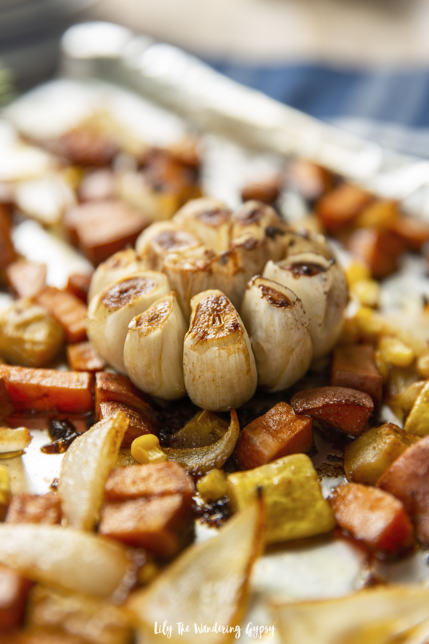 2.) In a medium to large mixing bowl, mix up all marinade then add veggies to mixing bowl. Use tongs to coat all vegetables, then transfer all veggies to sheet pan(s). To create the garlic head, simply cut off the top of the garlic to expose the cut tops of each clove, while still leaving the rest of the head in tact.
