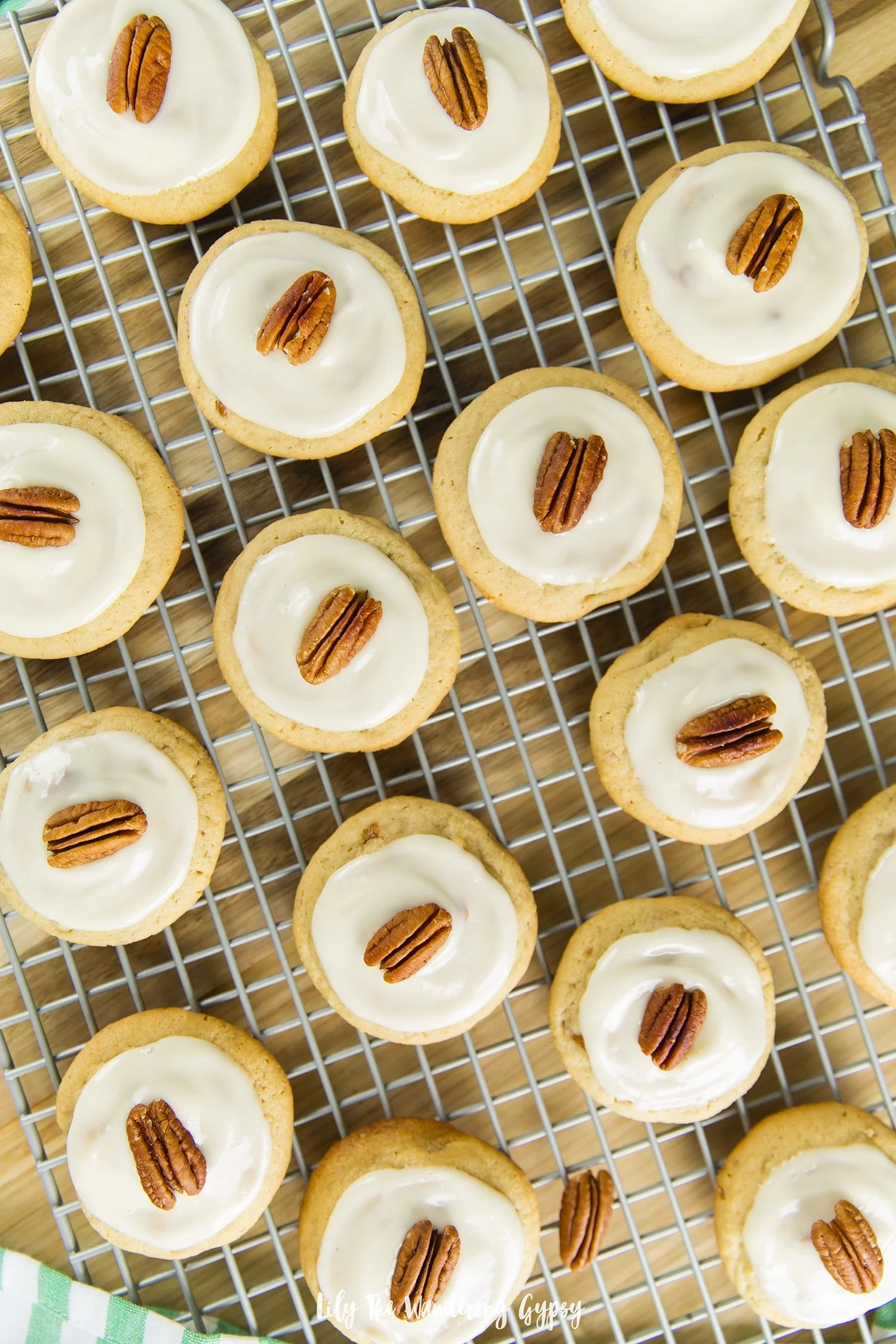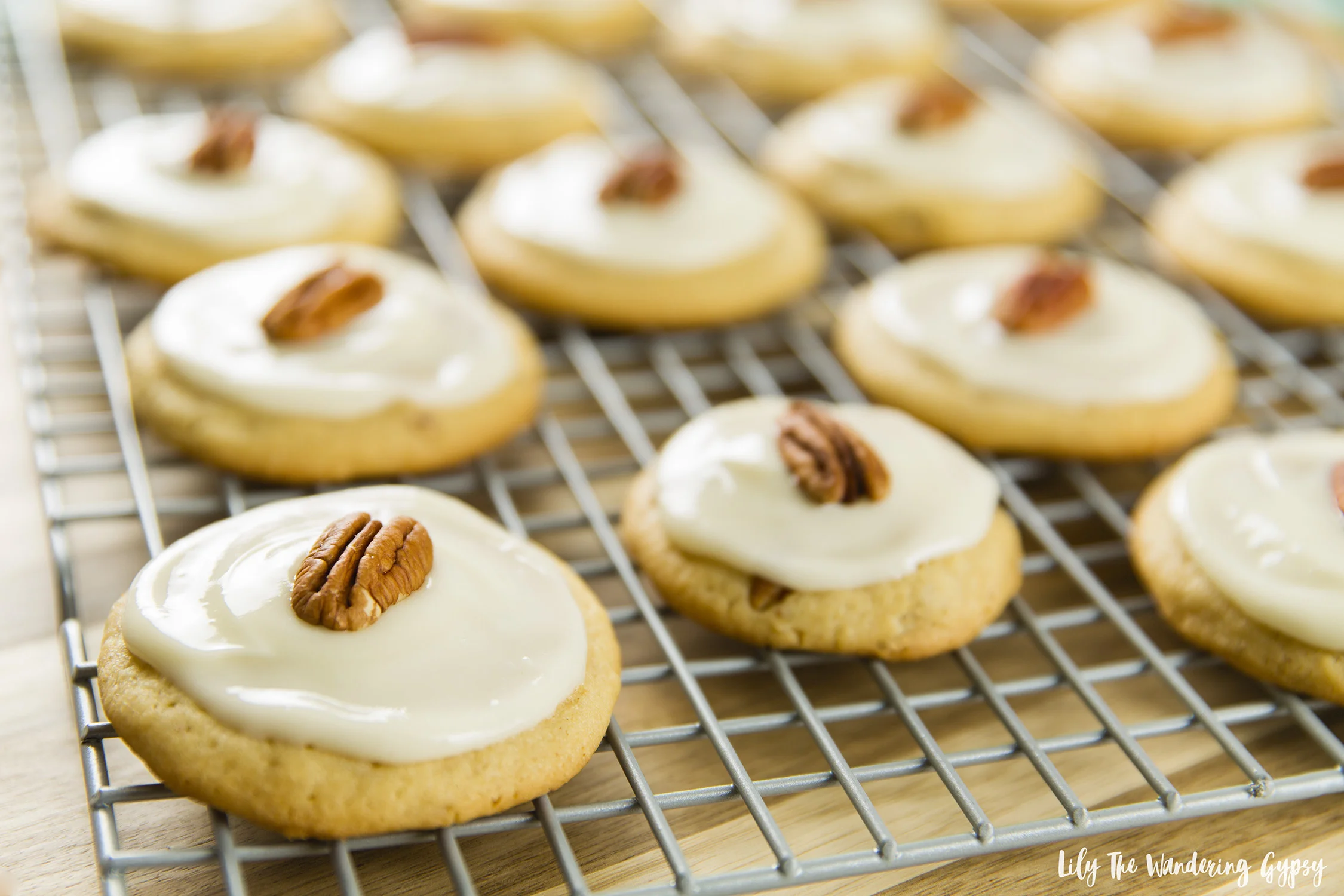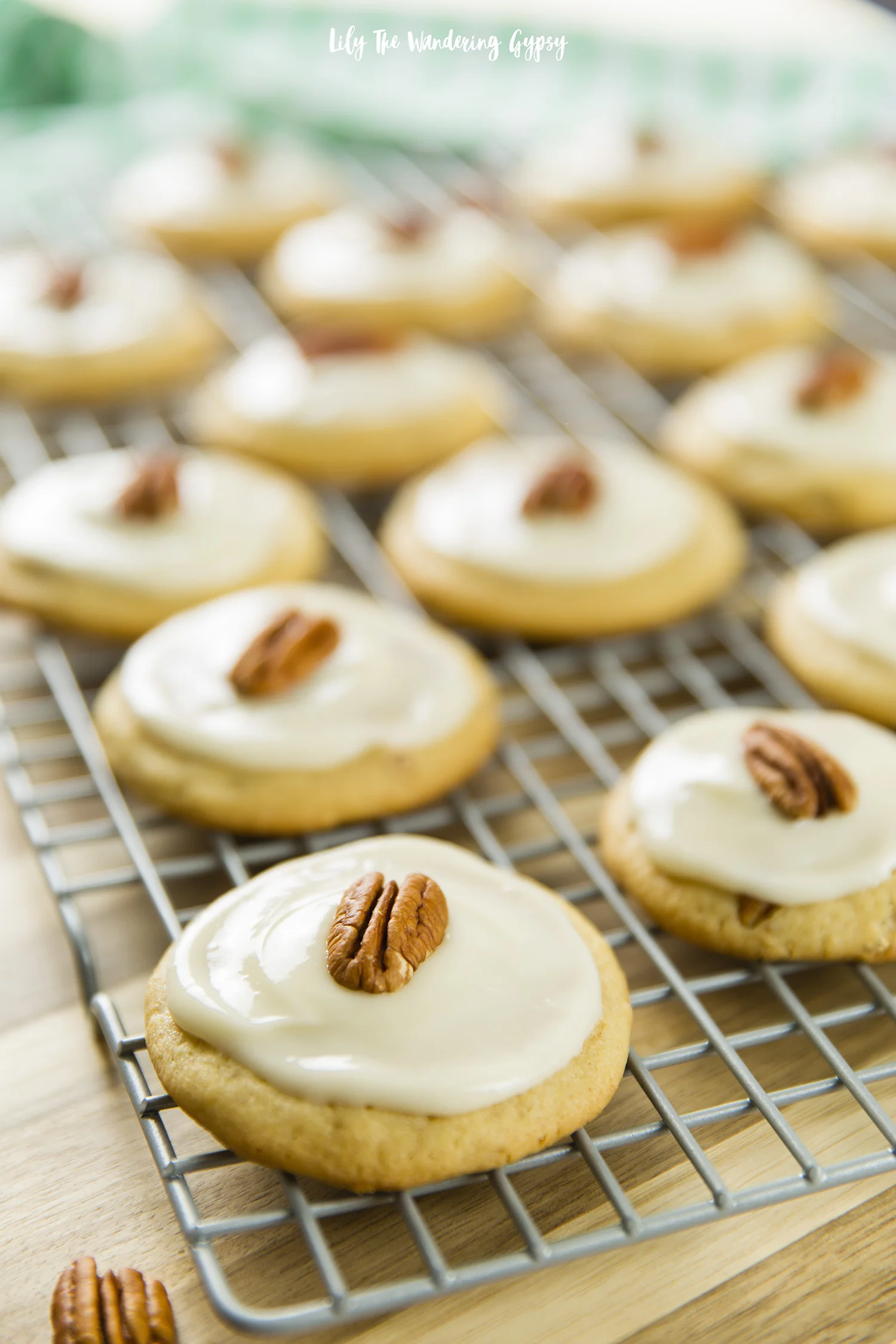 4. Meanwhile, make frosting and get ready to decorate cookies. Let cookies cool completely, then use a spoon to layer on a circle of icing. The icing was super smooth and easy to work with. Top each cookie with a pecan right after icing them. Enjoy!