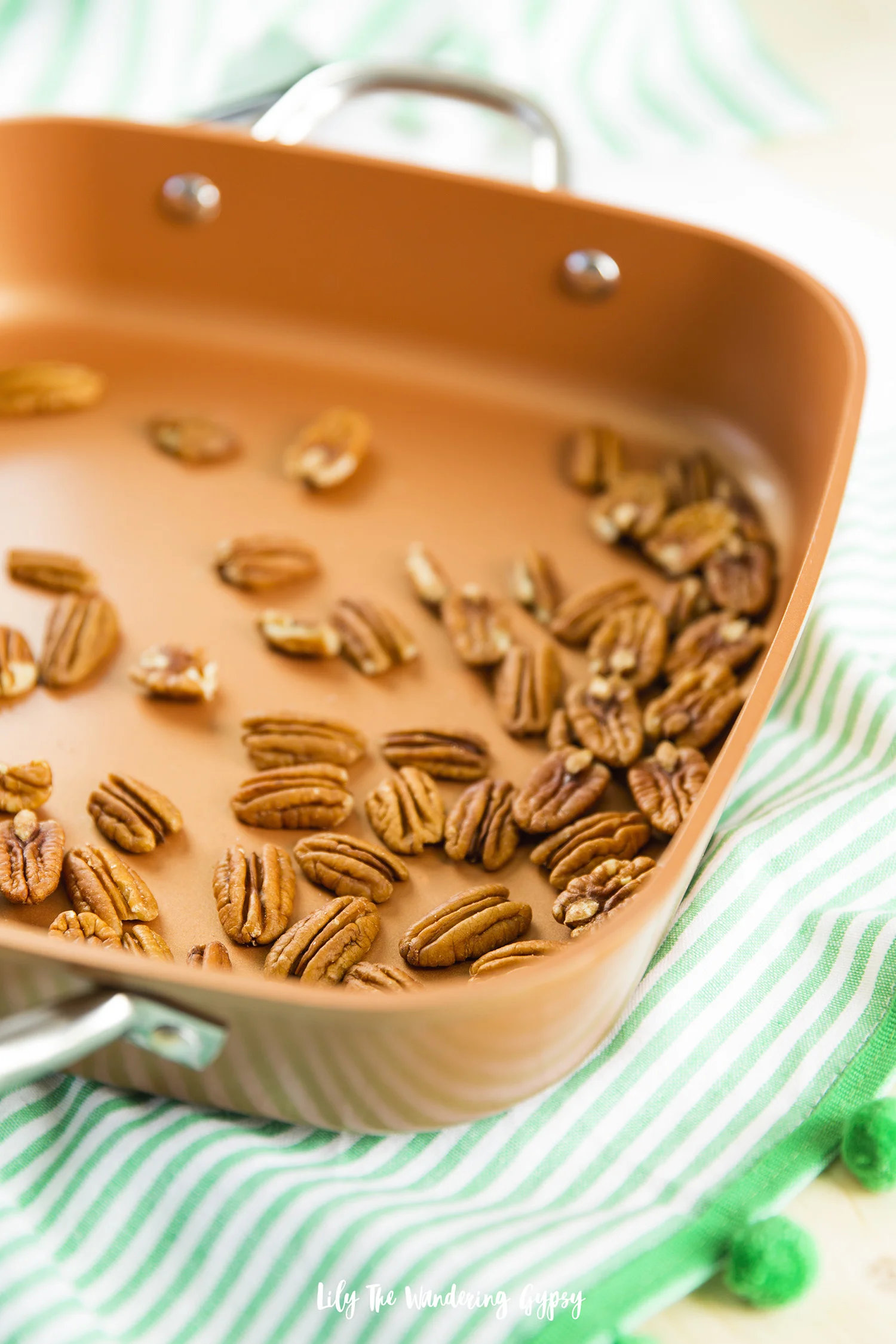 Note - to toast your pecans, either place them onto a skillet on medium heat for about 6-7 minutes (see below), or bake them in the oven while oven is preheating - check at 5 minutes, then every 2 minutes after so they do not burn!