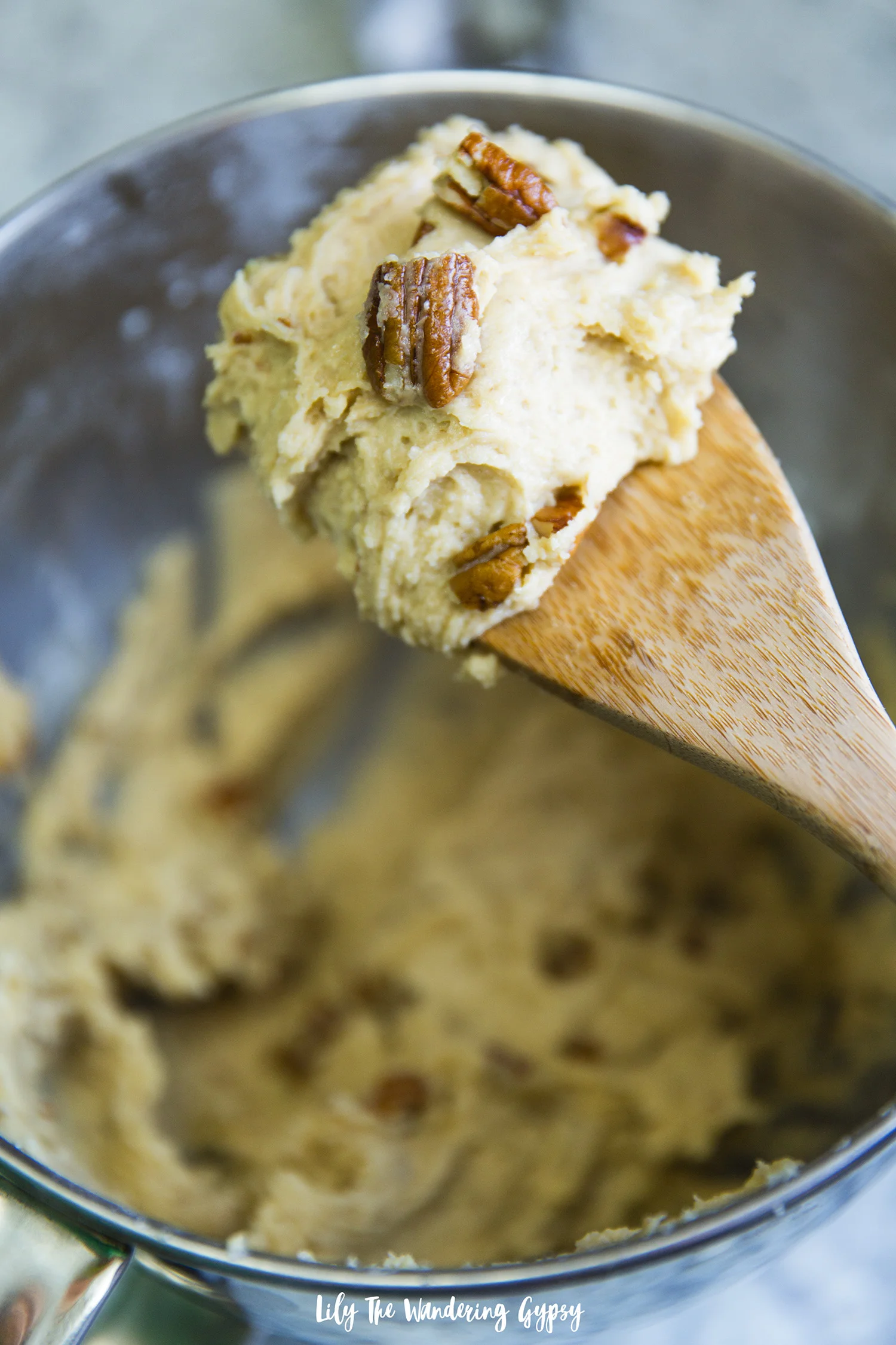 2. Add sifted flour, baking soda, and salt, and beat again until just combined. Lastly, add chopped pecans and stir by hand until incorporated.