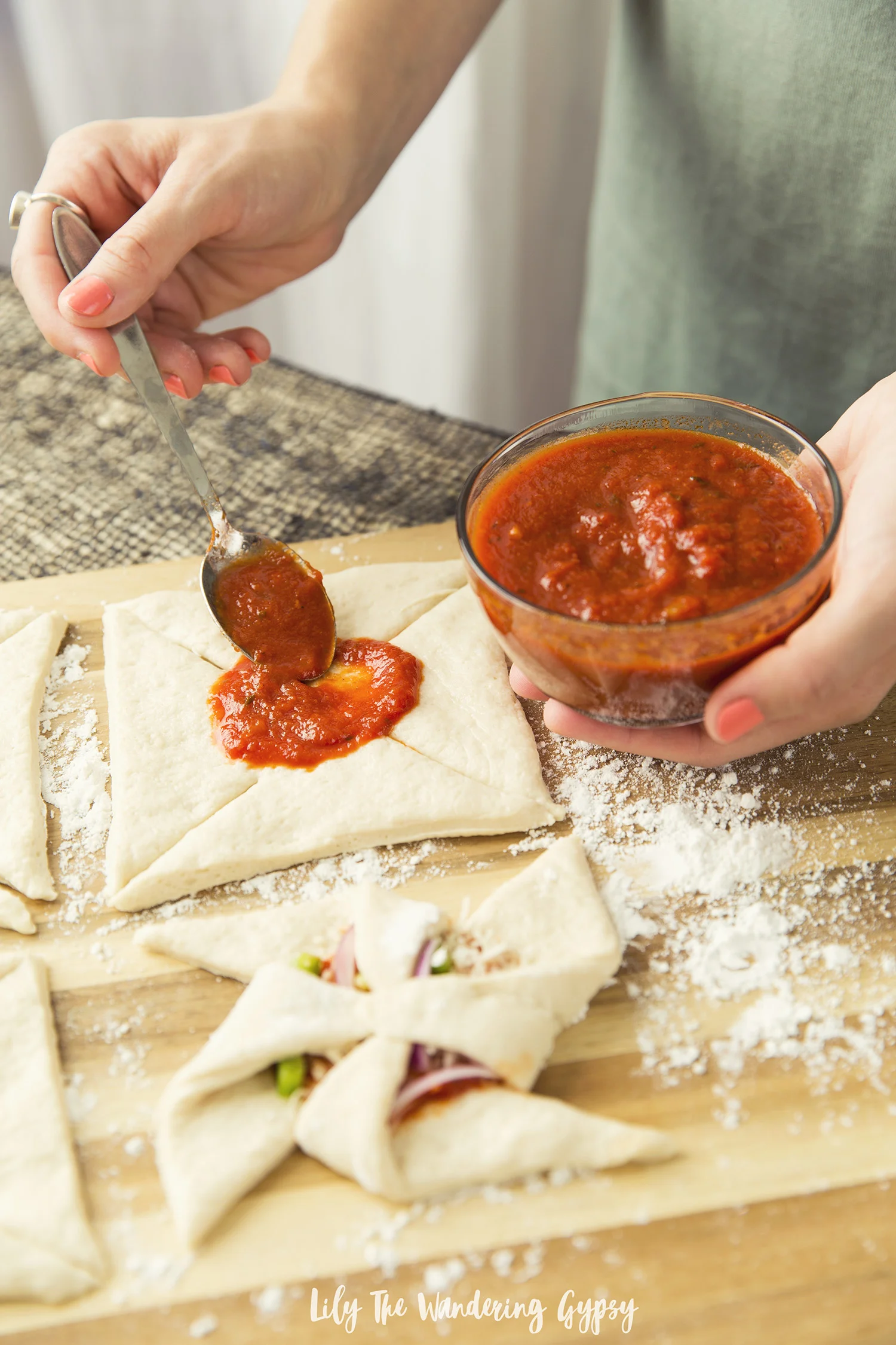 1.) Preheat oven to 400* F and roll out your pizza dough onto a floured surface. This is optional, but it really makes the crust look great.