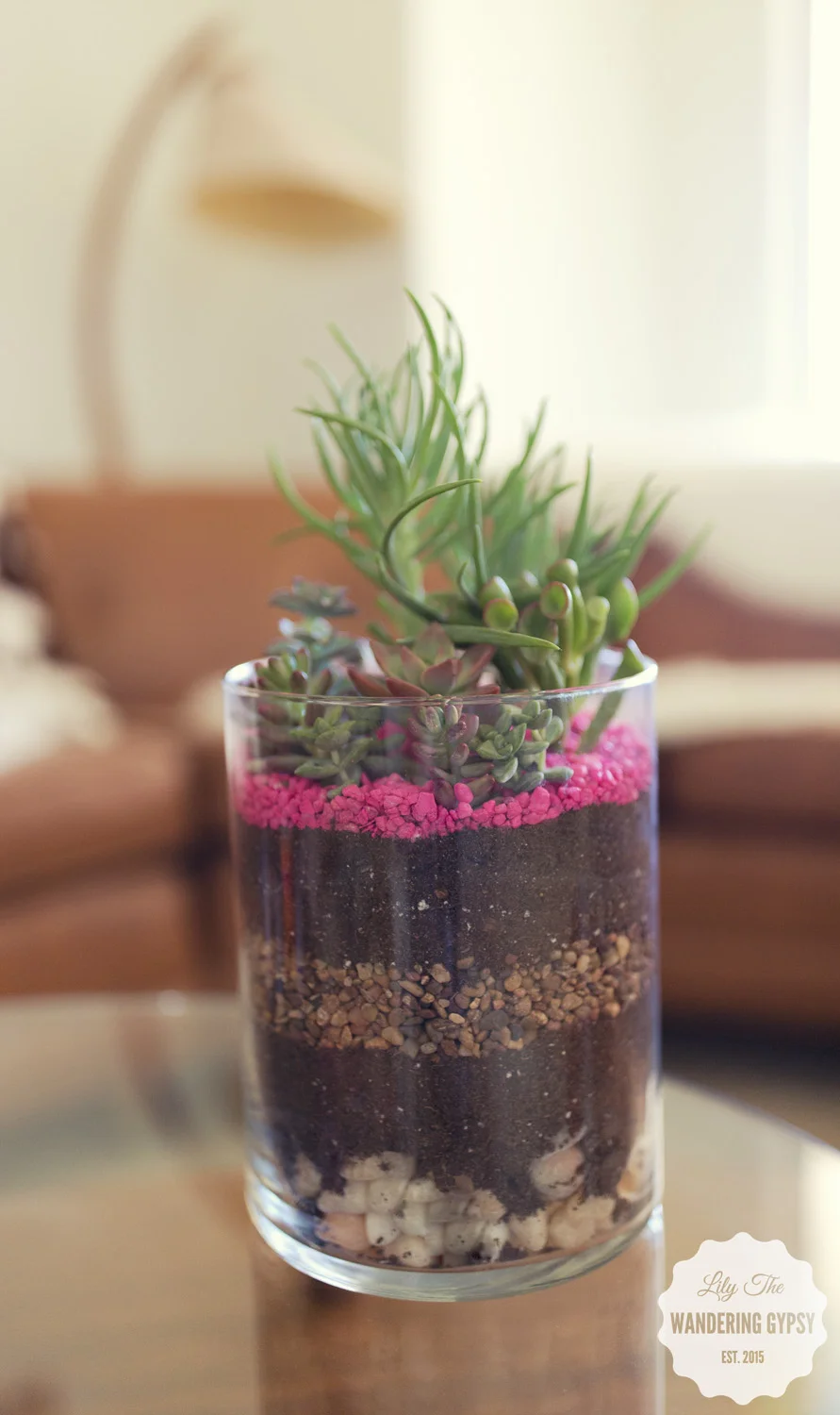 In a tall glass container , or glass container of your choice, add an optional layer of activated charcoal. Next, add about 2 inches of larger pebbles. Add a layer of dirt on top, then pat the dirt down with the back of your hand, to create a flat surface. Next, add white or brown colored aquarium rocks, and flatten them with your hand. Add a bit more dirt, almost to the very top, but leaving about 1-2" of space at top. Do a test arrangement by placing the potted succulents into the container. Feel free to break apart plants if it looks like there are multiples in one container. Once you have a layout that you like, take the succulents out of their container (over a bucket or similar), and knock off as much loose dirt as you can. Place plants into dirt and add a bit more dirt on top. Now, using a funnel, add pink rocks around plants, to hide all dirt. That's it! A fun project you can create in an hour or so!