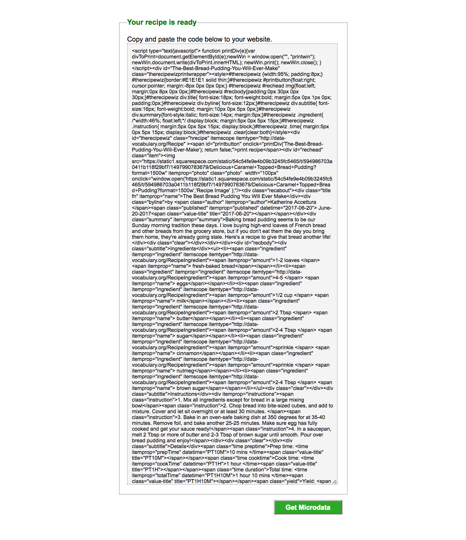 After that, click "Get Microdata" and it will create some code for your Recipe Card.