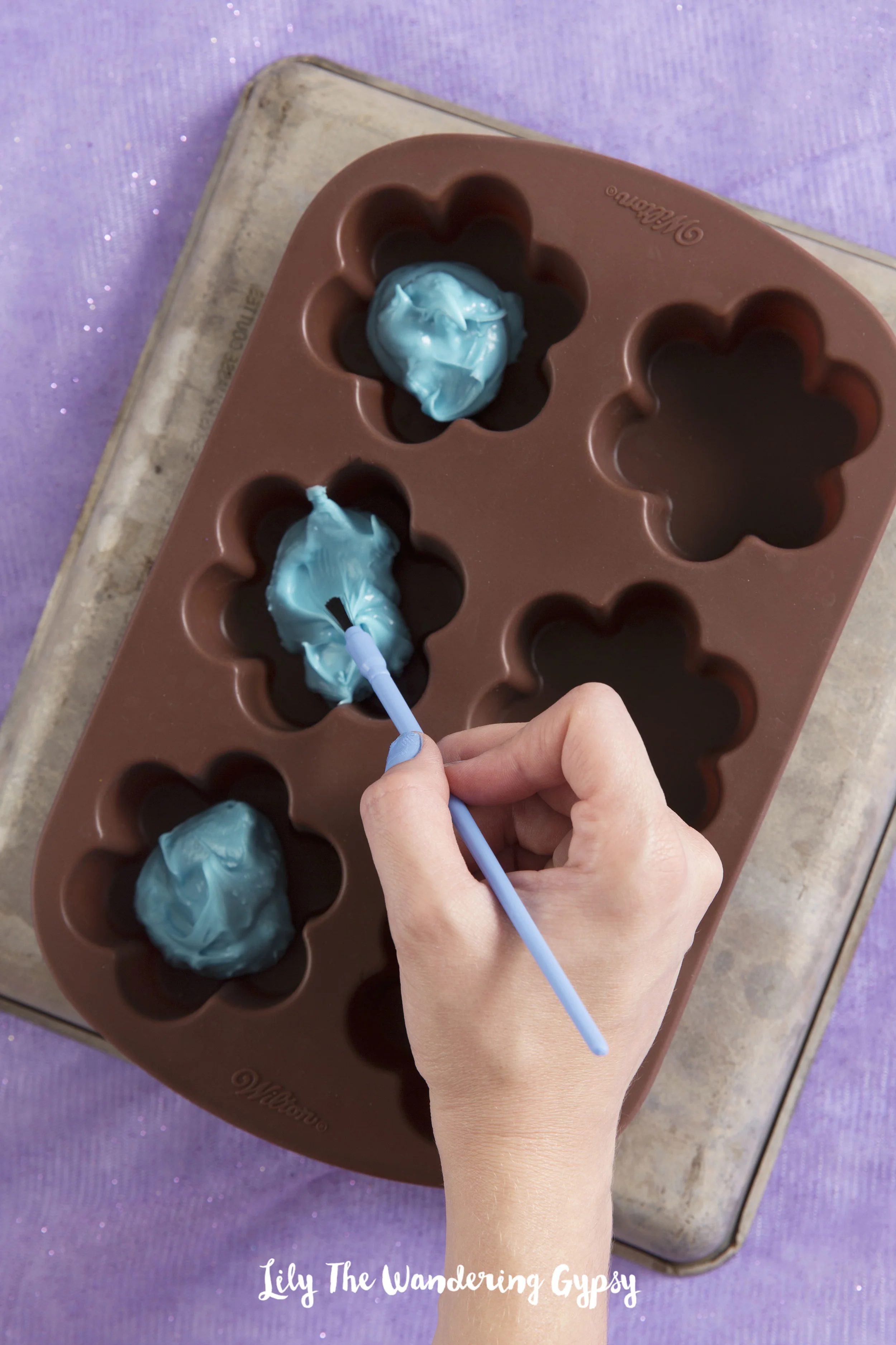3.) See how I spread the blue candy melts into the molds with a paintbrush, and am about to spread the green candies next. I added about double this amount (that you see in green) to fill the mold at first. After you fill the molds, pop the candies into the freezer for about 5 minutes.