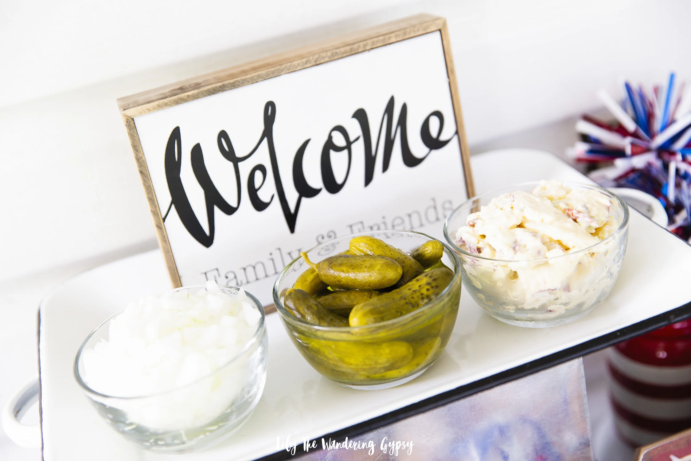Below, the white chopped onions, pickles, and potato salad, and a cute sign that reads, “Welcome Friends and Family”.