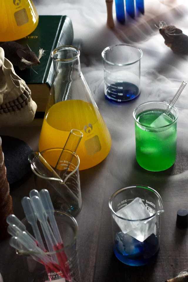 Here is a more sophisticated way to serve drinks in beakers. I could also see making a larger scale punch (or even sangria) for your party and use a larger beaker as a carafe.